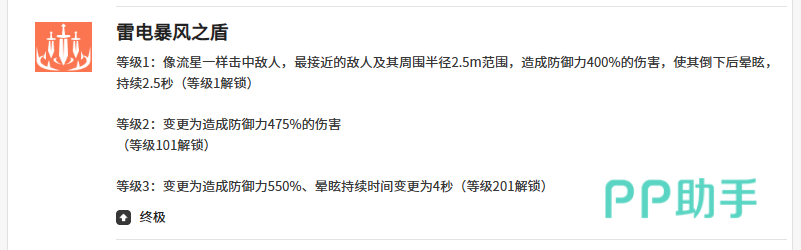 终极技能【雷电暴风之盾】兼具爆发与强控:对2.5米范围内敌人造成400%防御力值的高额伤害,并对倒地目标追加2.5秒眩晕。该技能不仅承担核心输出职责,更可作为衔接控制链的枢纽技,为队伍创造多段技能循环空间。