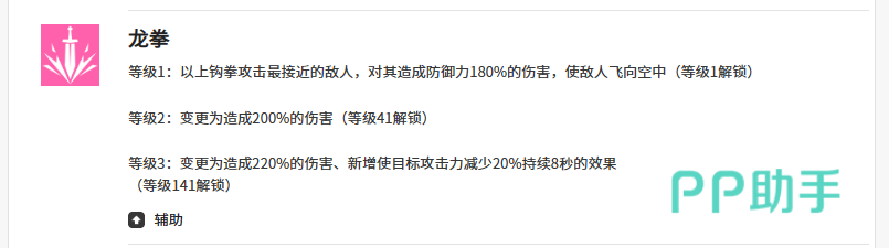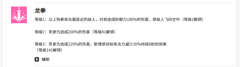 三技能【龙拳】为突进型主动技,以180%防御力转化为上勾拳伤害,并附带击飞效果。命中后还可降低目标20%攻击力,持续一定时间。其被动【不屈不挠的意志】在克罗伊成为敌方集火焦点时自动触发:当生命值低于35%时,立即提升40%物理抗性和40%魔法抗性,恢复7%最大生命值,并返还部分能量。该被动整场战斗仅可生效一次,属于关键保命与反打枢纽。