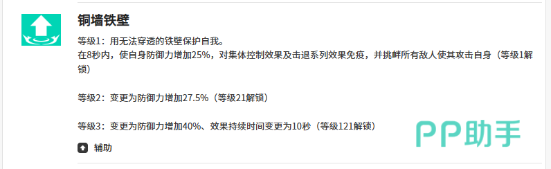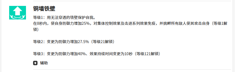 二技能【铜墙铁壁】提供周期性自我强化:每8秒自动激活一次,永久提升自身25%防御力(可叠加)。同时,该状态下克罗伊完全免疫气体类击退效果,并可主动施放嘲讽,强制吸引范围内敌方单位的攻击目标,是构建前排承伤体系的重要保障。