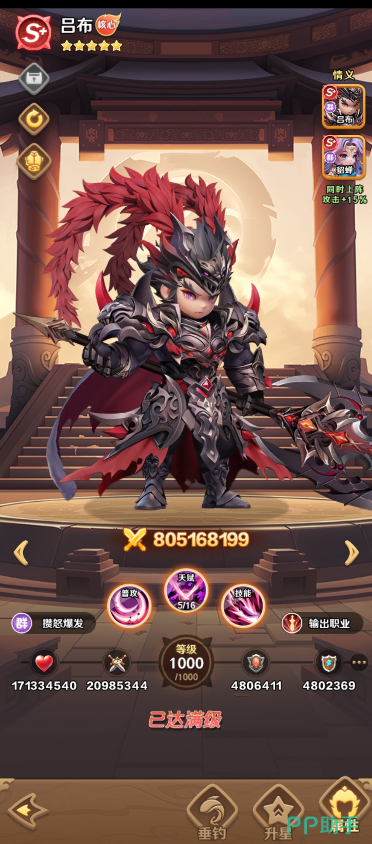吕布属于典型的后期质变型爆发武将。前期需通过战斗积攒怒气,一星解锁后获得“无双乱舞”——对全体敌人造成伤害并附加额外怒气获取效果;怒气充足时可瞬发终结技,实现全场秒杀。该角色对装备与星级依赖较高,但成型后拥有极强的翻盘能力与PVE清屏效率,建议中后期集中资源突破。
