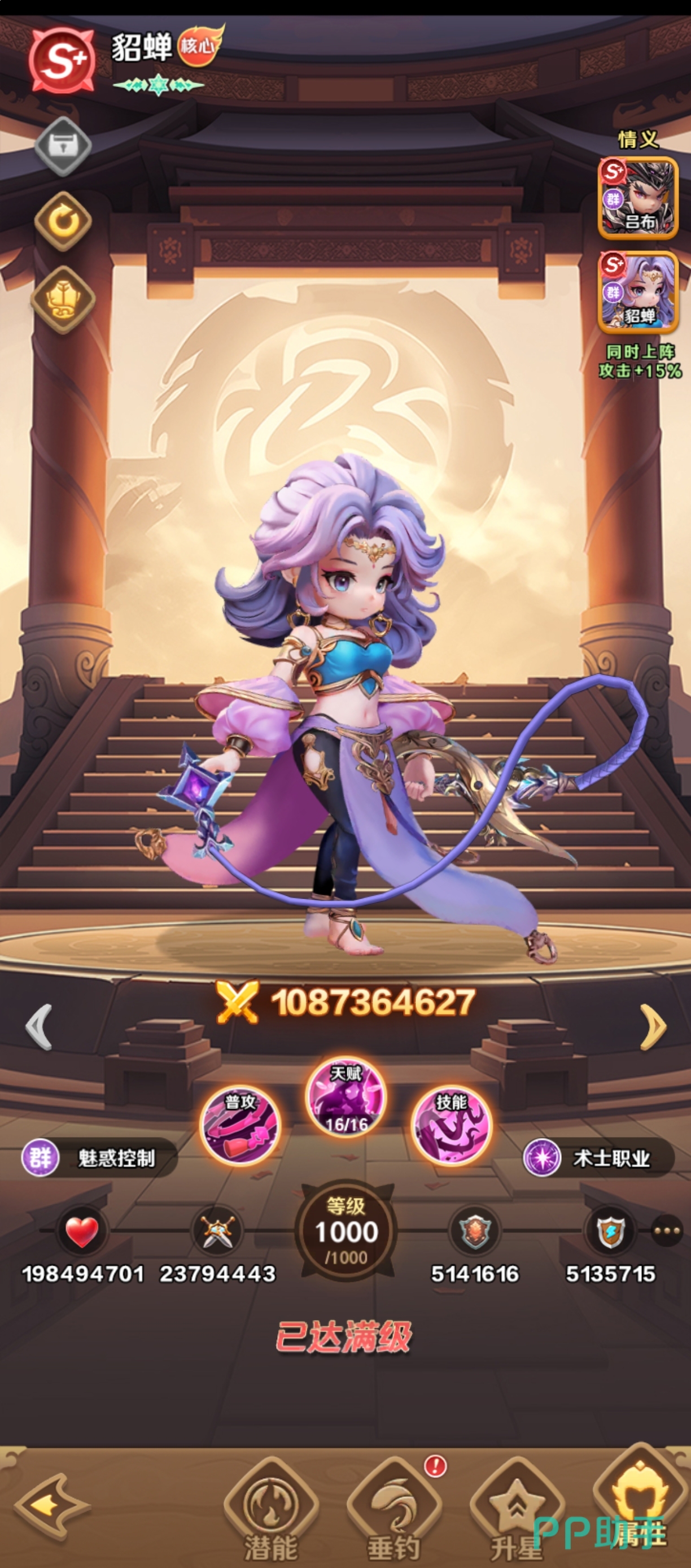 神貂蝉定位为顶级群体控场兼功能型辅助。其普攻自带“闭月”减伤状态,可持续降低敌方全体受击伤害;主动技“魅惑”可同时锁定三名目标,配合开局即释放机制,实现五人全控起手。此外,该角色还具备怒气返还与攻击加成双重增益,在持久战与多段回合对抗中价值极高,是组建魏/群混搭阵容的理想枢纽。