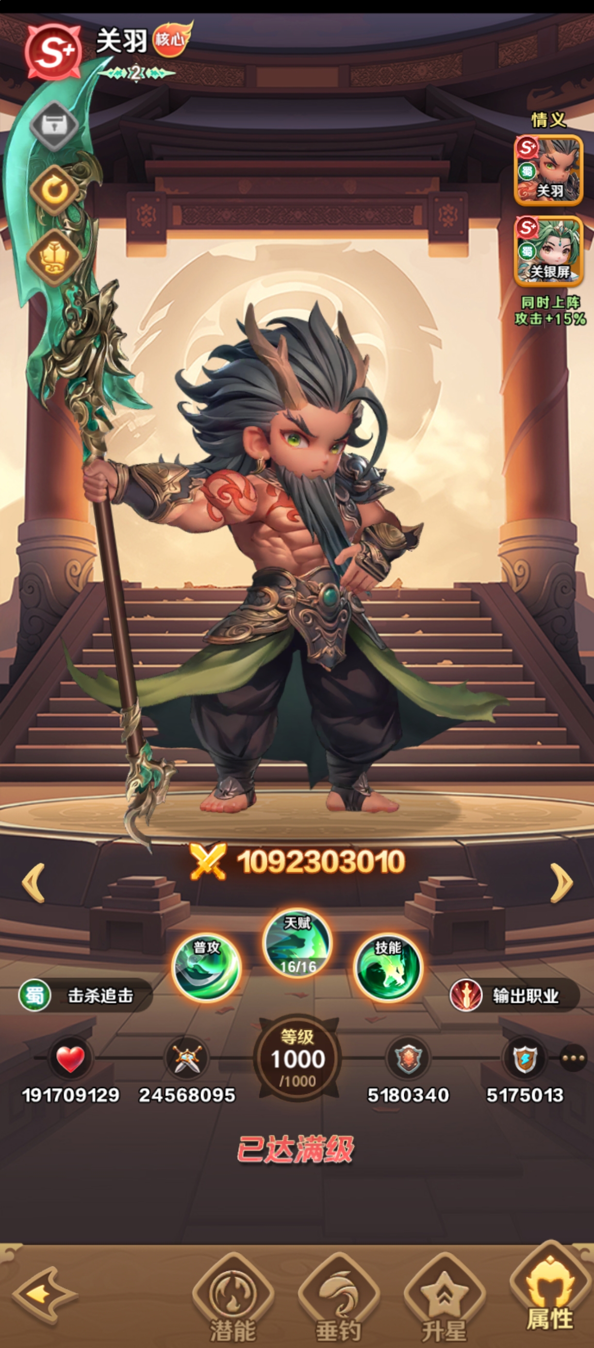 关羽是当前蜀国体系中不可替代的高阶单点收割者。其机制围绕“失血增伤”构建:普攻与主动技能均随自身已损生命比例提升伤害倍率;当天赋升至满阶后,可稳定触发高额单体爆发,并附带吸血与破防效果。在面对高护甲Boss或需要快速斩杀敌方核心单位时,关羽的实战压制力极为突出,推荐作为首期主力培养对象。