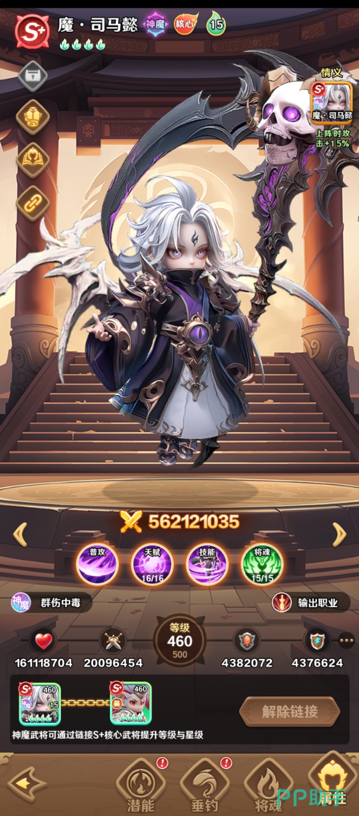 魔司马懿以持续毒伤与防御穿透为核心特色。每次施放技能均可对敌方全体叠加1层“蚀骨毒”,每层降低目标12%攻击力;叠满5层后,可无视目标35%防御值。该机制使其在长线消耗战、多波次守关及高难度爬塔场景中表现极为稳定,尤其适合搭配高频率技能循环队伍使用。