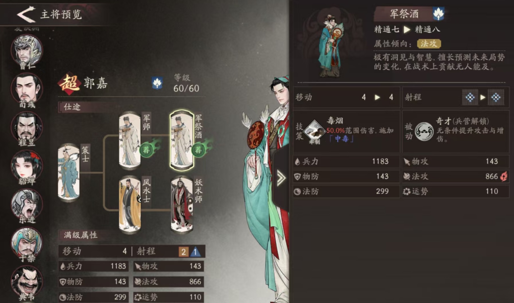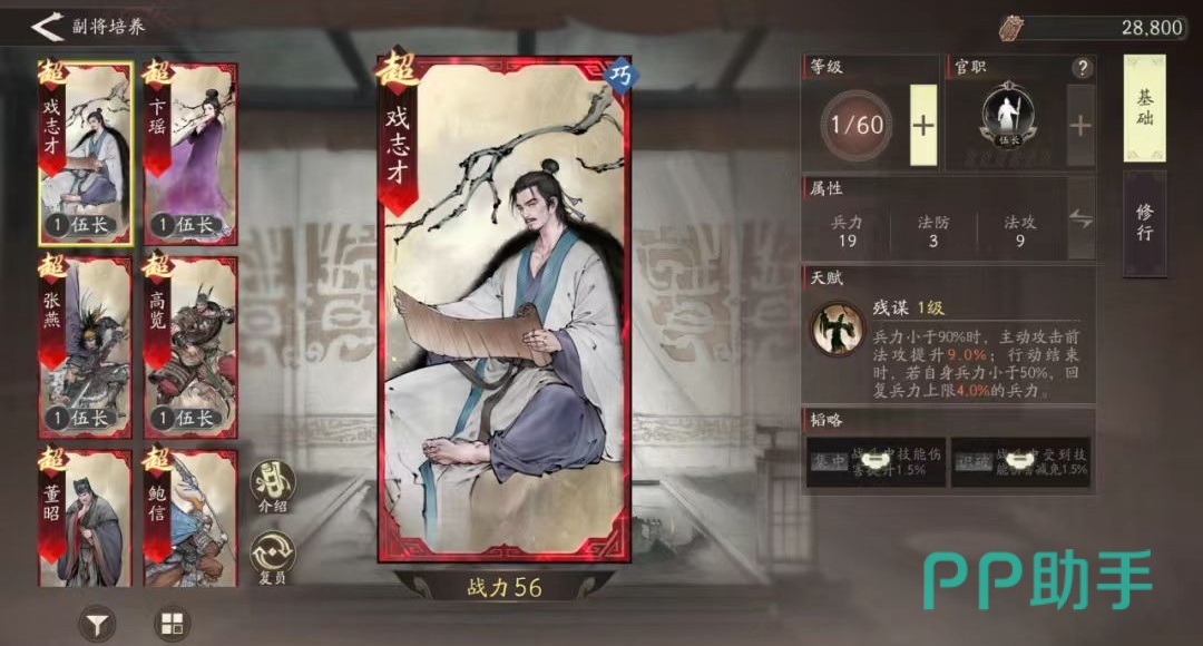 随着游戏多次版本迭代,副将系统得到了显著强化,戏志才也在调整中确立了稳定定位。其核心技能为“残谋”,具体表现为:当兵力低于90%时,主动攻击前可提升9%法术攻击力;若行动结束时兵力不足50%,则恢复自身最大兵力上限的4%。此外,通过解锁韬略系统,还能激活“集中”与“识破”两项增益——前者提高技能伤害,后者增加对敌方技能伤害的减免效果。