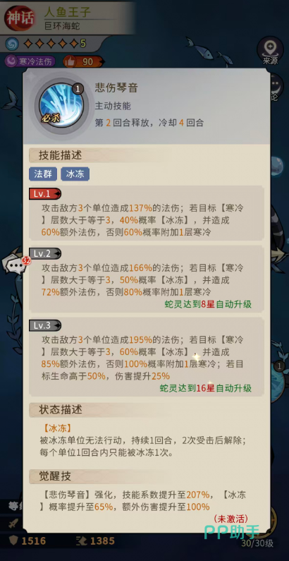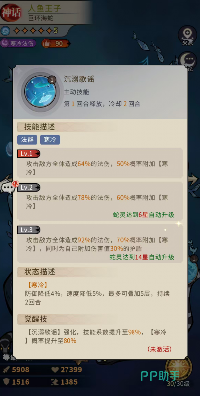 人鱼王子的一技能“沉溺歌谣”是其控制体系的起点:初始等级下,对敌方全体造成64%法术伤害,并有50%概率施加【寒冷】状态;每层【寒冷】降低目标4%防御与5%速度,叠满5层后,速度压制效果显著放大。升至技能三级后,伤害提升至92%,【寒冷】触发率增至70%,并额外为自身提供相当于本次伤害30%的护盾。值得注意的是,该技能仅需14星即可解锁三级效果,成长路径清晰,觉醒后技能系数进一步提升至98%,【寒冷】附加概率同步跃升至80%,奠定了其前期快速成型、中期稳定控场的基础。
