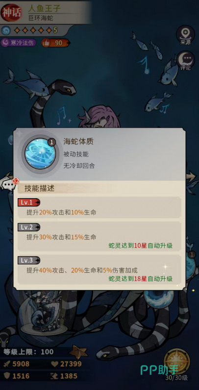 被动“海蛇体质”提供稳定的属性成长:初始提升20%攻击与10%生命;技能三级时增幅扩大至40%攻击、20%生命及5%伤害加成,有效支撑其在前排承伤与中后排输出间的灵活定位。