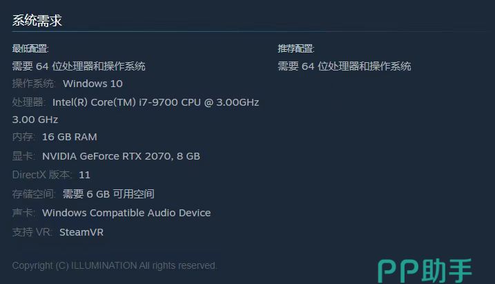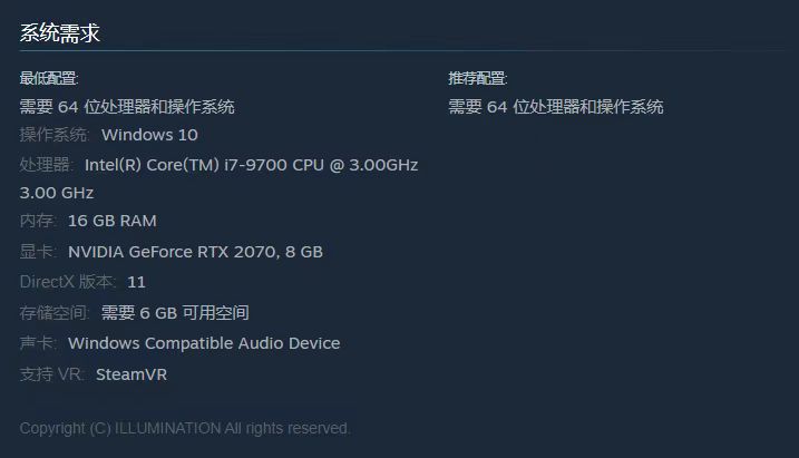 官方最低配置为64位Win 10系统,i7处理器,16GB内存,RTX2070显卡,DirectX 11,6GB硬盘空间,对于大部分玩家还是不算高的。