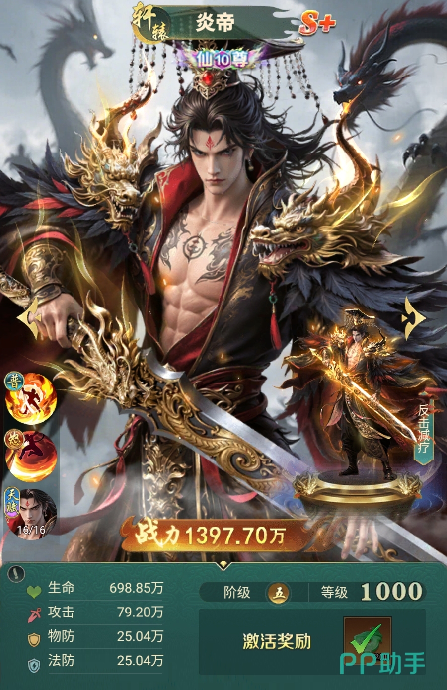 随着星级提升,炎帝的成长路径清晰且强势。升至九星后,触发被动“灼炎回生”:每承受四次普攻伤害,即可恢复一定比例生命值,大幅提升持续作战能力。当突破至真仙1重境界,解锁核心反击机制——无论受到普攻或技能伤害,均有概率立即发动一次反击;结合其前排站位与高频受击特性,单回合平均可触发3–4次反击。每次反击伤害固定为敌方当前最大生命值的5%,在多目标环境下叠加可观总伤,使其在高练度下成功转型为主力输出角色,兼具承伤与清场双重职能。