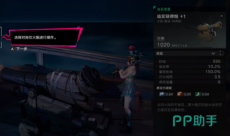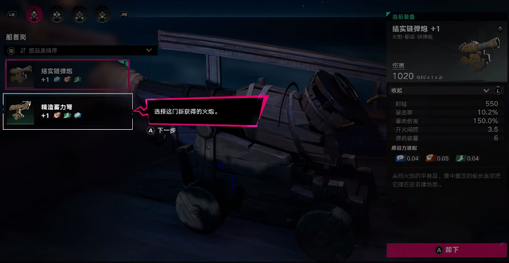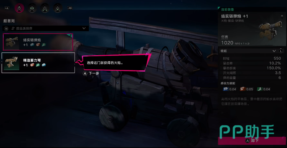 武器更换操作简洁直观:进入“岗位装配”界面,选定船首位置(结实链弹炮默认安装于此),点击当前武器图标即可触发替换或卸载指令。确认后进入武器库页面,所有已获取武器将按类型与等级清晰罗列,支持一键装配。例如,通过战斗掉落获得的“精造蓄力弩”,即具备明显射程优势,可直接替换结实链弹炮,大幅提升中远距离压制能力,为后续高难度海域挑战奠定基础。