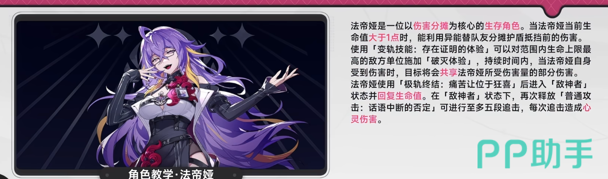 各角色极轨终结存在显著差异化设计。以法蒂雅为例,其终结技将激活「敌神者」状态,彻底重构输出循环:进入该状态后,角色将发动6段潜意识伤害,并同步恢复生命值;若在状态持续期间立刻接续一次普攻,还可触发追击链,最多实现5段连续追击。需特别注意:该状态在角色切换瞬间即刻解除,务必确保完整连招打完后再执行换人操作。此外,当法蒂雅当前生命值低于破灭阈值时,释放节能技可提升后续极轨终结的伤害倍率并额外恢复血量,形成“残血反杀”闭环。
