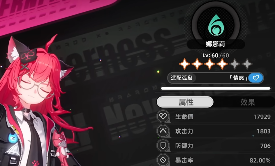 娜娜莉为本队唯一主C,属限定UP角色,预计开服后仍将保持限定获取方式。其基础面板突出——未满星状态下暴击率已达82%,配合高额生命值与攻击力成长,使其驻场爆发能力极为显著。弧盘首选“预备备”,提升百分比攻击力并附带攻击增益效果;空幕锁定“森林萤火之心”,专精驻场期高倍率输出。词条优先级为暴击率>暴击伤害>攻击百分比,此搭配可最大化发挥其高暴击基础下的伤害转化效率。