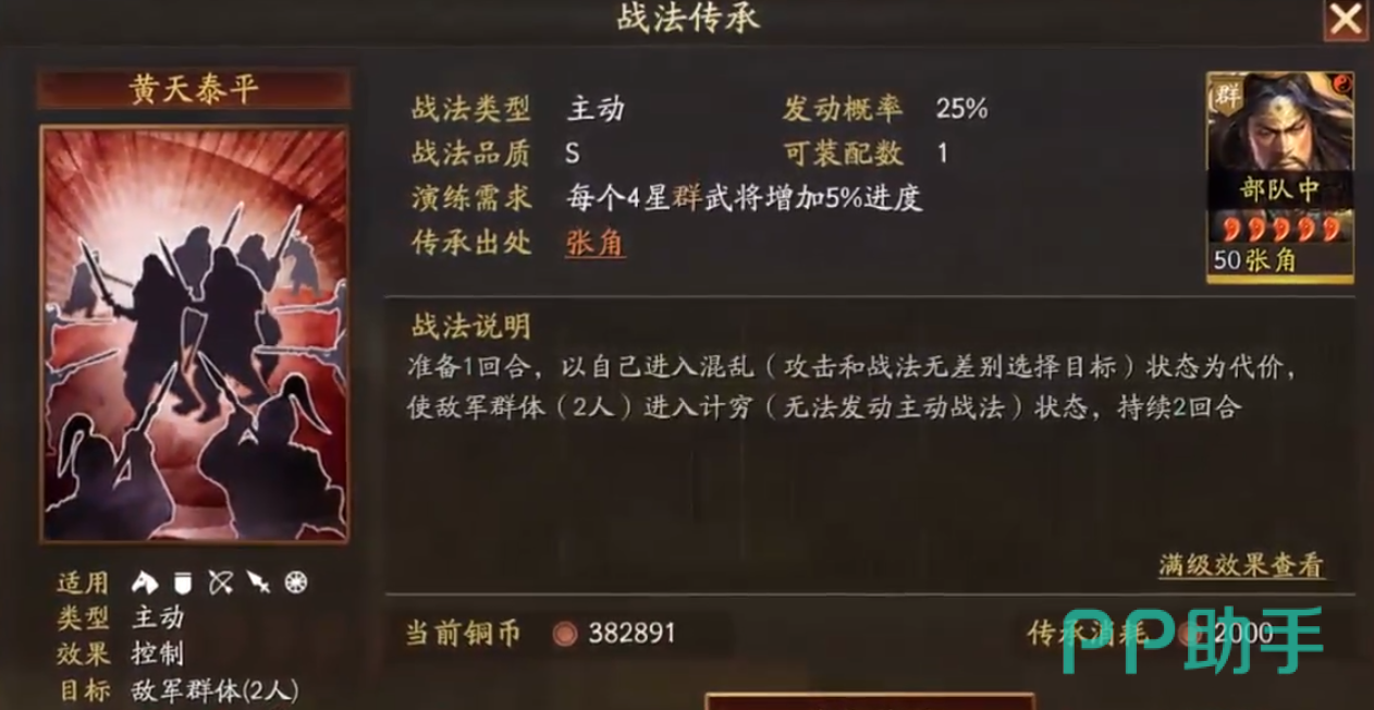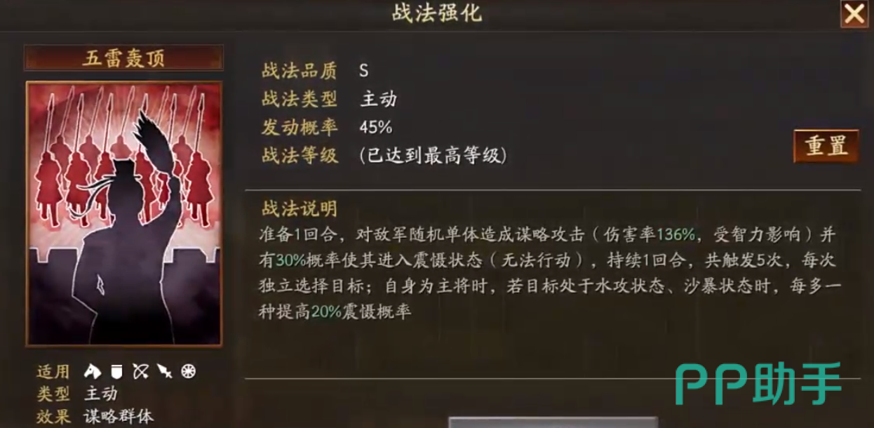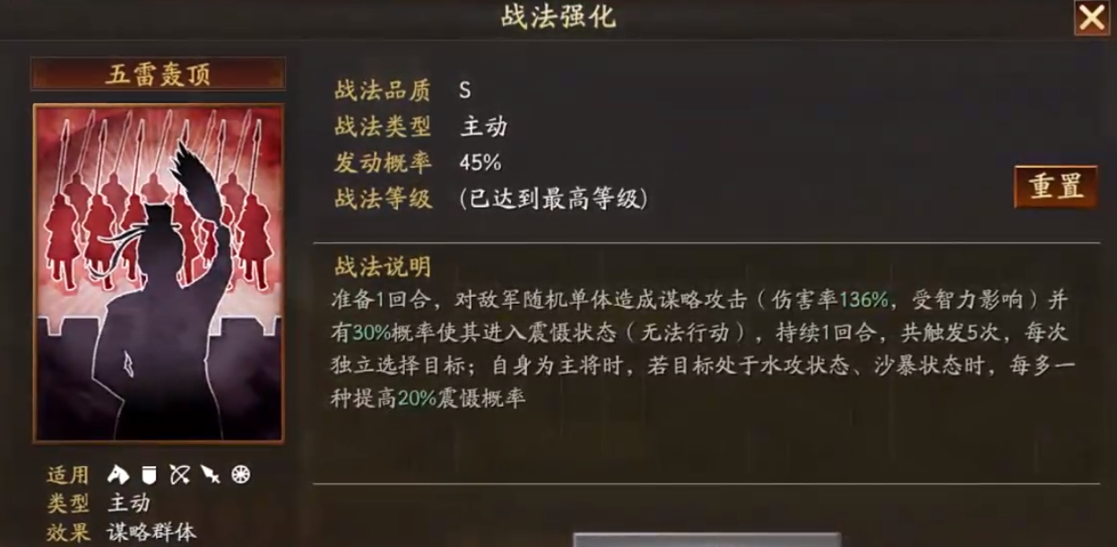 “五雷轰顶”为准备一回合的主动战法,拥有45%基础概率对单体目标发动5段连续伤害,合计造成680%谋略伤害,并附带主将增伤效果。关键机制在于:当敌方目标已处于“水攻”或“沙暴”状态时,每存在一种该类减益,即可额外提升20%震慑触发率。这一设计使张角在配合特定战法体系时,既能打出可观总量伤害,又能频繁打断敌方行动节奏。
