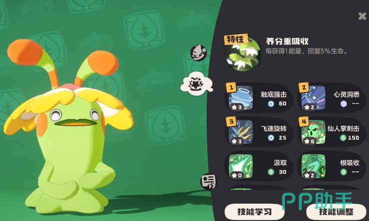 之所以很多玩家比较喜欢这个精灵,主要是因为精灵的技能非常多,在初级状态下会有触底强击的技能,等等级得到提升之后还可以逐渐解锁心灵洞悉、飞速旋转和仙人掌刺击,另外这个角色有比较独特的一个特性,就是养分重吸收,角色每获得一点能量就可以恢复自身5%的生命值,一旦获取了这个精灵之后,他就会用头部顶着玩家前进。