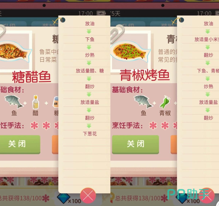 首先小编给这些菜谱进行简单的分类,让玩家,们对这些菜谱的类型和口味更加清楚。首先为大家推荐的是鱼类菜谱,在游戏中关于鱼的菜品可是获得顾客的一致好评哦!鱼类最新的菜品是【龙啸九天】菜谱为鱼、糖、醋、胡萝卜。【糖醋鱼】:鱼、醋、糖、葱花。【青椒烤鱼】:鱼和青椒,