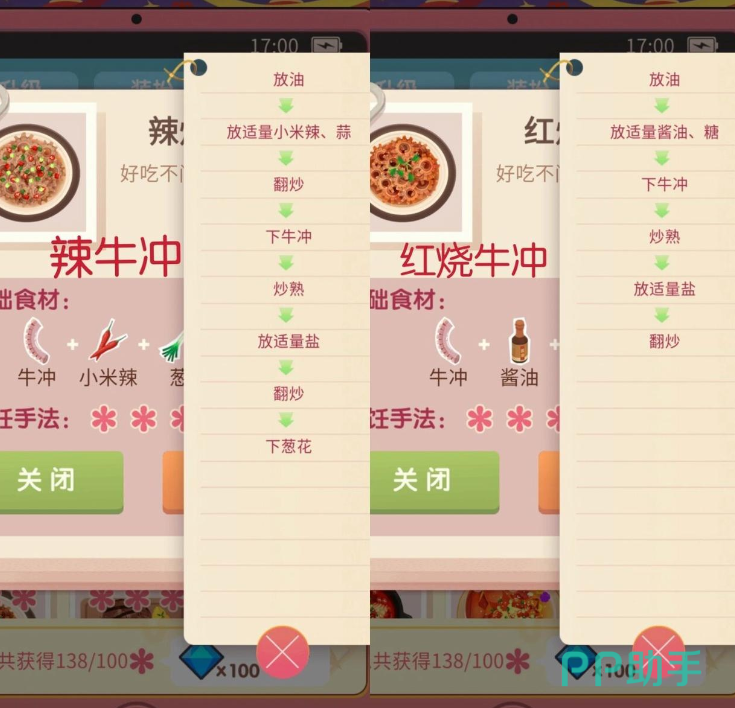 上面为小伙伴们推荐的菜谱制作和需要的材料都不困难,在游戏中是最热门的菜品。接下来是牛肉菜谱,在肉菜中牛肉的热销量也是比较恐怖的,爆辣的【辣炒牛冲】:需要牛冲、小米辣、葱花。需要注意每个客人的口味略有偏差,游戏中的调料是通过圈数来进行判断。【红烧牛冲】;牛冲、酱油。醇香可口的牛冲可是很热门的菜品哦!