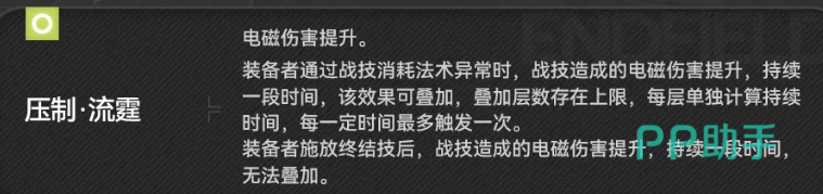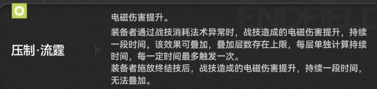 当装备者通过战技消耗法术异常状态时,将触发“压制流霆”的叠加效果:每次触发提升战技造成的电磁伤害,持续时间独立计算,最高叠加层数存在硬性上限,且每单位时间仅可生效一次。