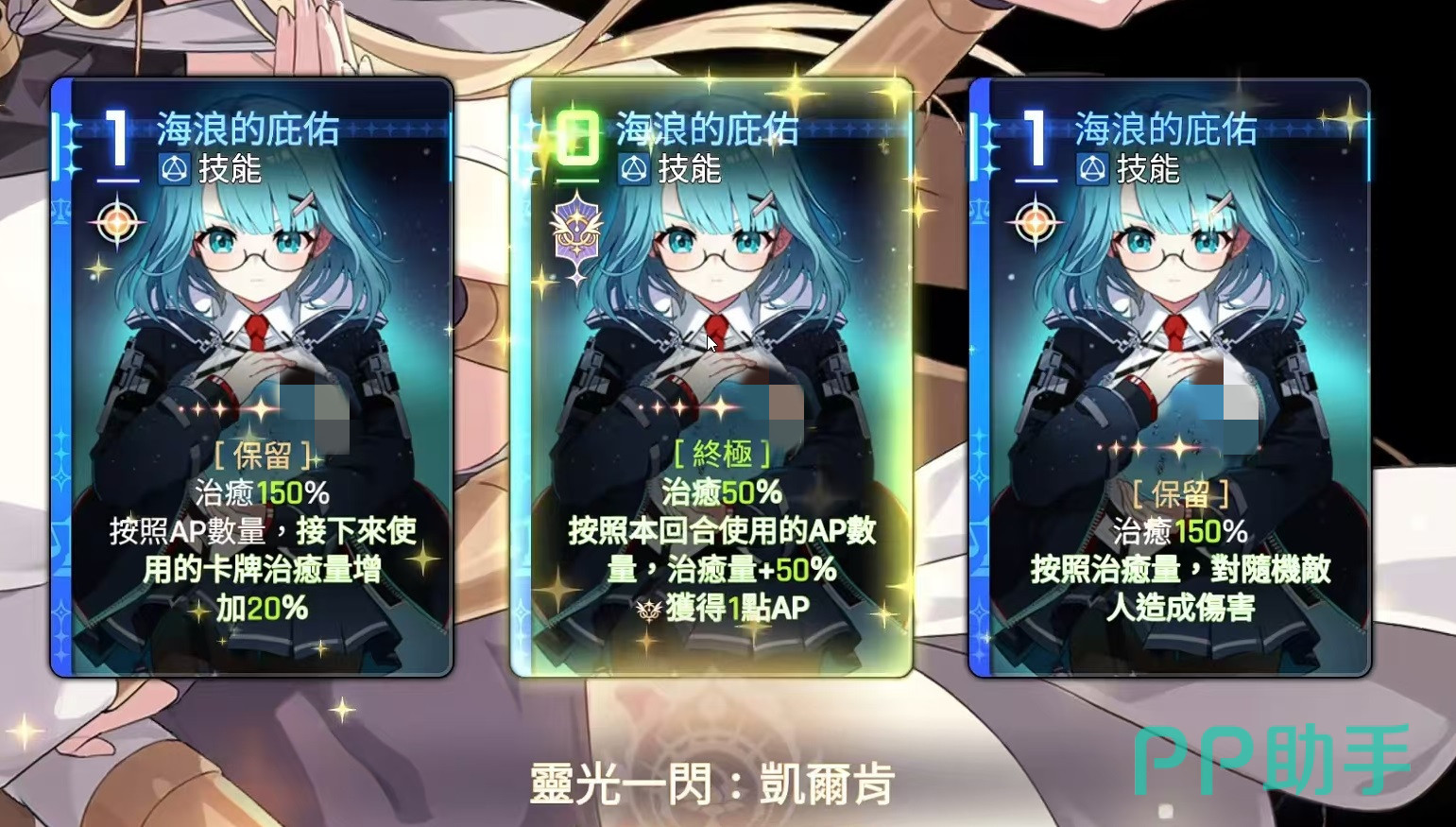 然而,并非所有神闪效果都值得无条件选择,必须结合具体增益内容进行判断。虽然大多数神闪带来的强化极具价值,但也存在个别设计略显尴尬的情况。例如下图所示的米卡技能“海浪庇护”触发神闪后,效果变更为“终极”,即使用该卡后当回合立即结束,尽管附带少量AP恢复,整体实用性却大打折扣,属于典型的鸡肋强化。