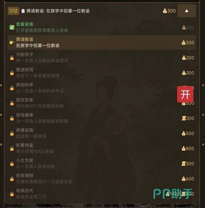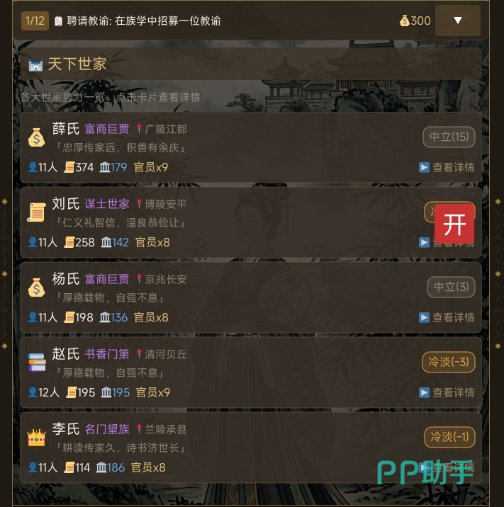 家族生存与发展不仅依赖内部建设,更仰赖外部关系网络的精密编织。玩家可通过礼聘、互市、共御外患等方式深化与其他世家的协作层级;亦可借联姻缔结血缘同盟,稳固区域影响力;更高维度的策略则指向皇权中枢——主动结交太子、攀附重臣乃至面圣陈策,皆可为家族获取关键庇护、政策倾斜或特殊敕令,显著降低发展过程中的不确定性风险。