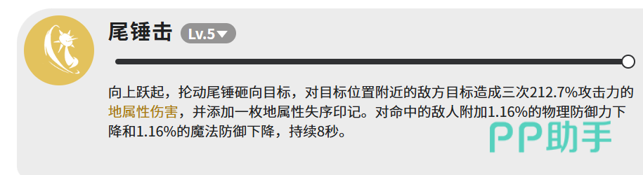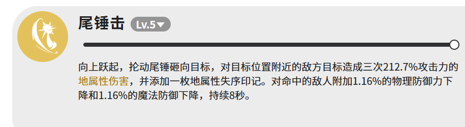 技能体系共含三项,设计逻辑清晰、分工明确。首推核心技【尾锤击】:铁球蜥跃起挥尾,以尾端铁球实施三段范围砸击,每段造成212.7%攻击力的地属性伤害,总倍率超600%。命中后为目标附加“地属性失序印记”,并同步降低其物理防御与魔法防御各1.16%,持续8秒。该技能兼具高额爆发、群体压制与团队增益功能,是整套打法的启动键与节奏支点,建议全程保持最高释放优先级。