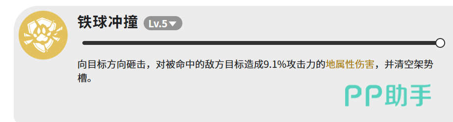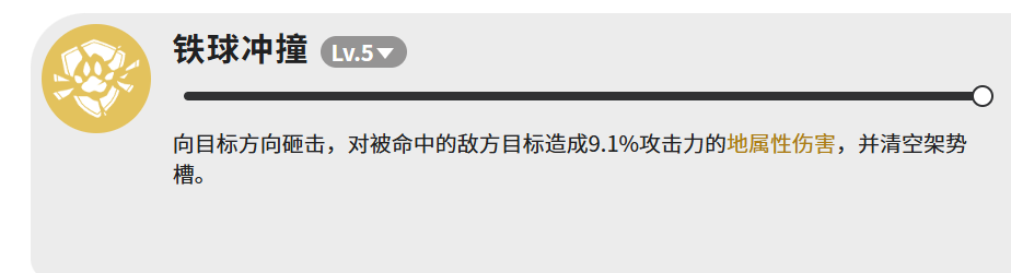 【铁球冲撞】表面伤害仅9.1%攻击力,实则为关键机制型技能:命中即完全清空目标当前架势槽。在《蓝色星原:旅谣》战斗系统中,架势槽满值常触发敌人强化状态或特殊行动,因此该技能本质是高价值打断与节奏重置工具。使用需预判——务必在敌方架势槽即将溢出前精准释放,方能最大化战略收益。
