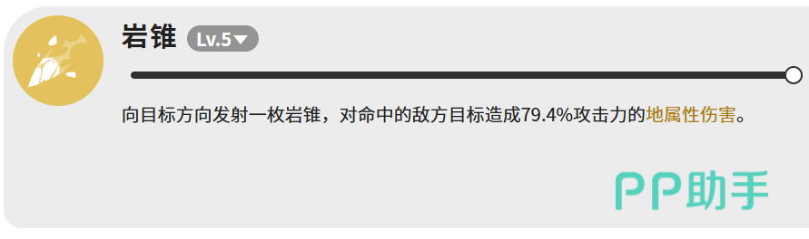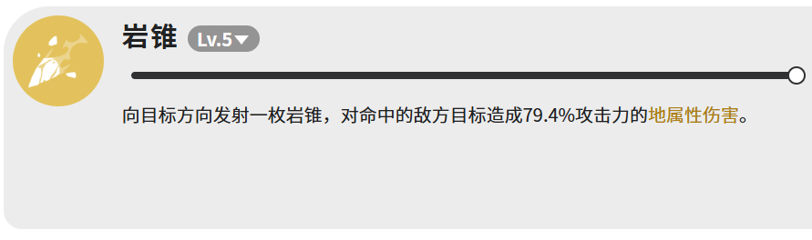 【岩锥】为稳定单体补刀技:向目标方向投射一枚岩质尖刺,造成79.4%攻击力的地属性伤害。虽倍率中等,但释放迅捷、命中可靠,专用于衔接尾锤击冷却间隙,维持连续压制力,避免输出断档。