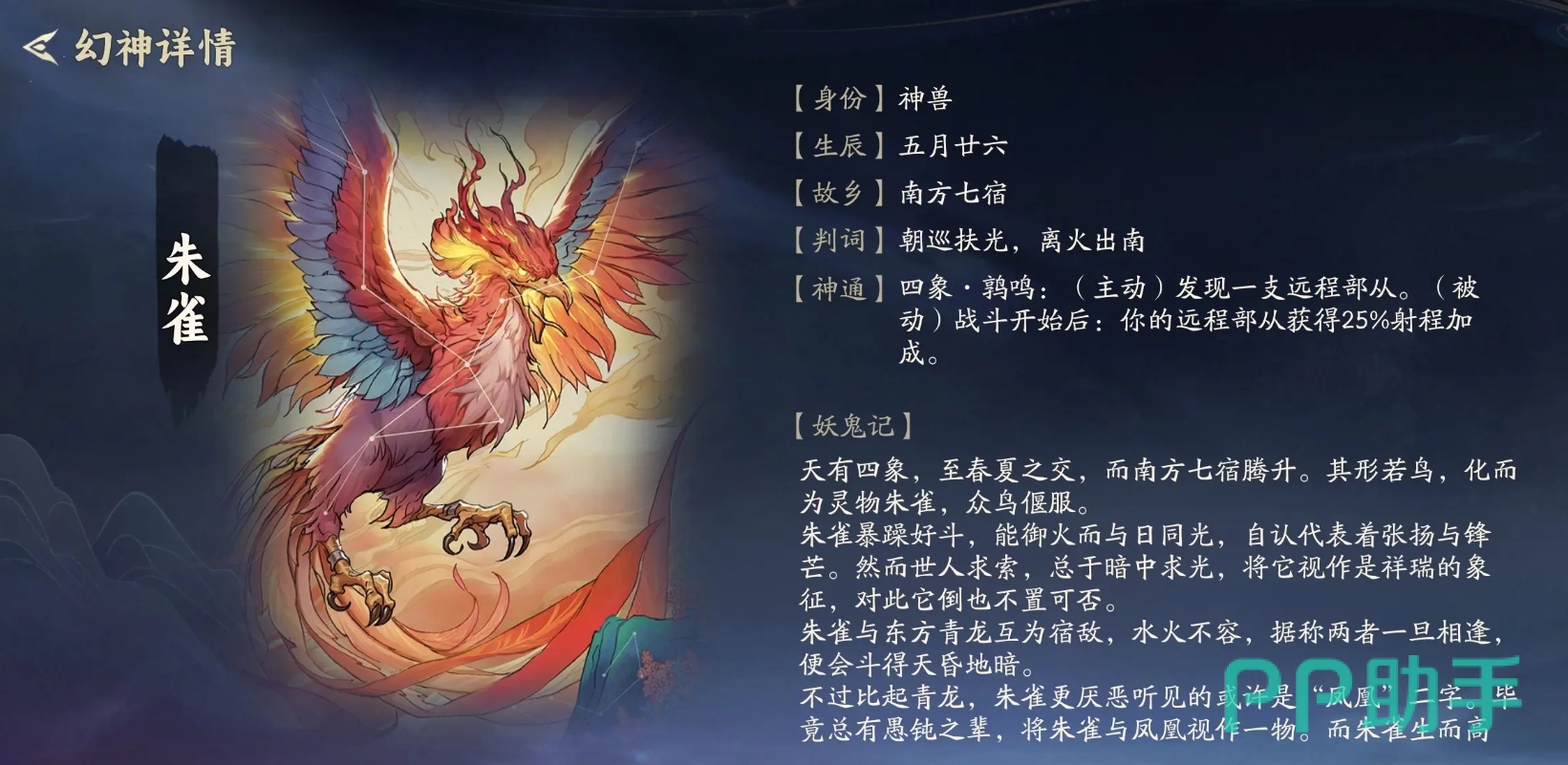 朱雀专精远程战术体系,具备双重辅助能力:其一为定向发现机制,可主动从天书中锁定一支远程部从,加速远程阵容搭建;其二为常驻被动——所有己方在场远程单位基础射程提升25%。该加成直接扩大火力覆盖范围,使敌方难以近身,尤其在狭窄地形或关键节点布防时,能实现持续压制与先手消耗。