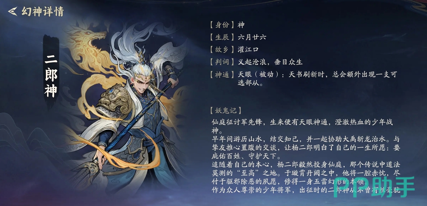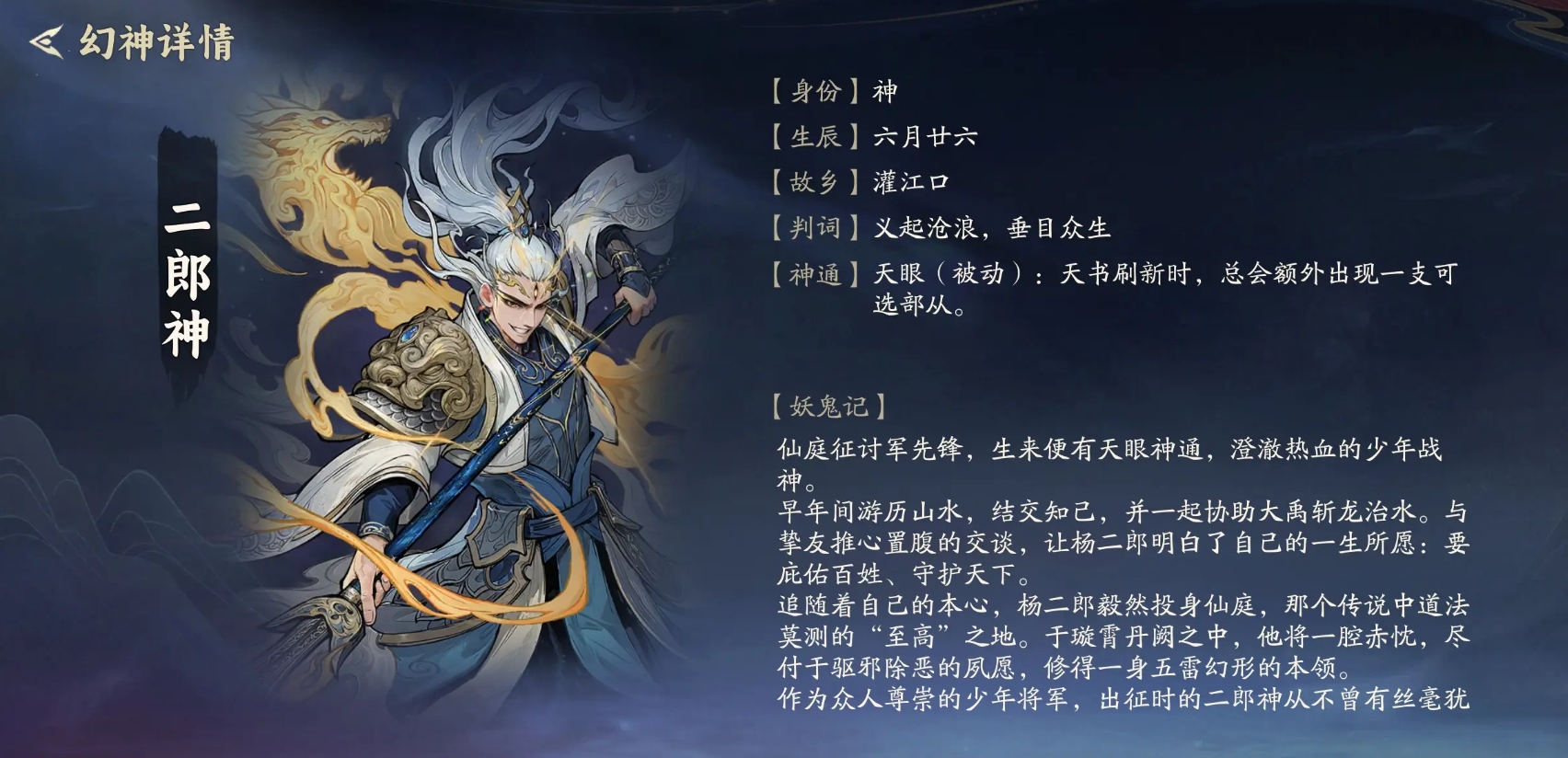 二郎神定位为稳健运营型幻神,机制简洁却极具策略价值:每次天书刷新时,必定额外提供一支可选部从。这一设定显著提升关键组件的获取效率,降低阵容成型随机性,使玩家能更精准地围绕目标体系(如连携、羁绊或功能链)快速构筑完整阵容,在中期即形成强度压制,减少因卡牌缺失导致的节奏断档。