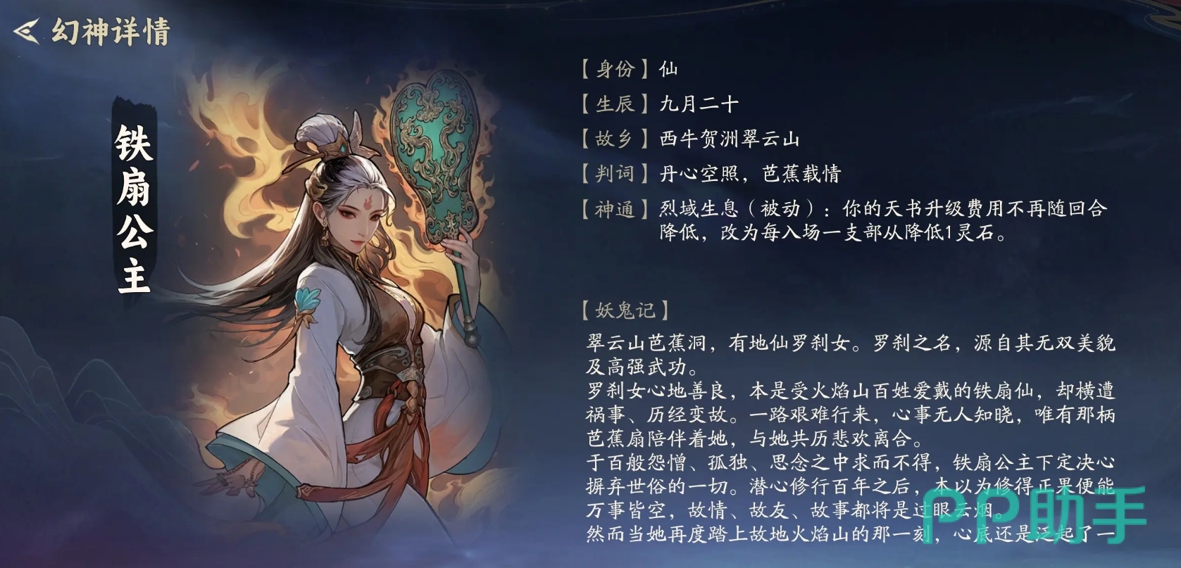 铁扇公主考验玩家的资源规划能力。其机制为:每部署一部从,天书升级所需灵石减少1点(该减幅不随回合推进衰减)。此效果在前期尤为关键,可比对手更早升至高等级天书,优先抽取三星及以上高阶部从,从而在质量层面建立早期优势。若运营得当,该滚雪球效应将贯穿整局,支撑起高上限的中后期决战阵容。