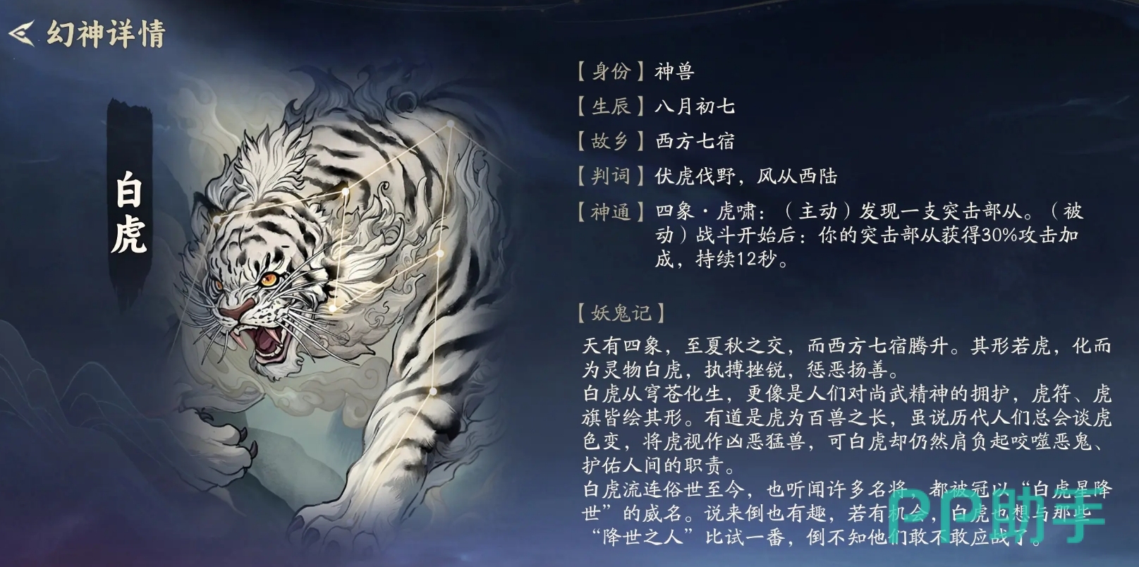 白虎主打前期节奏压制,适用于追求稳定前四、快速积累段位积分的玩家。其主动技能可立即发现一支突击部从,大幅缩短突击体系成型周期;战斗结束后,所有己方突击部从永久获得30%攻击力加成。该效果在1–4回合尤为突出,常能在对手尚未完成核心构建前完成斩杀,保障生存与晋级效率。