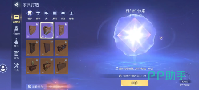 家具制作是家园建设的核心环节。玩家可进入家具打造界面,查看不同类别的物品选项,包括小摆件、桌类以及柜类等大型陈设。以石白柜为例,其制作不仅需要特定材料,完成后还能积累制作经验,用于提升制作等级。值得注意的是,各类家具的制作耗时各不相同,例如部分家具需耗时一小时,建议合理规划时间安排。随着制作等级逐步提高,更多高阶家具也将陆续解锁,丰富你的装饰选择。
