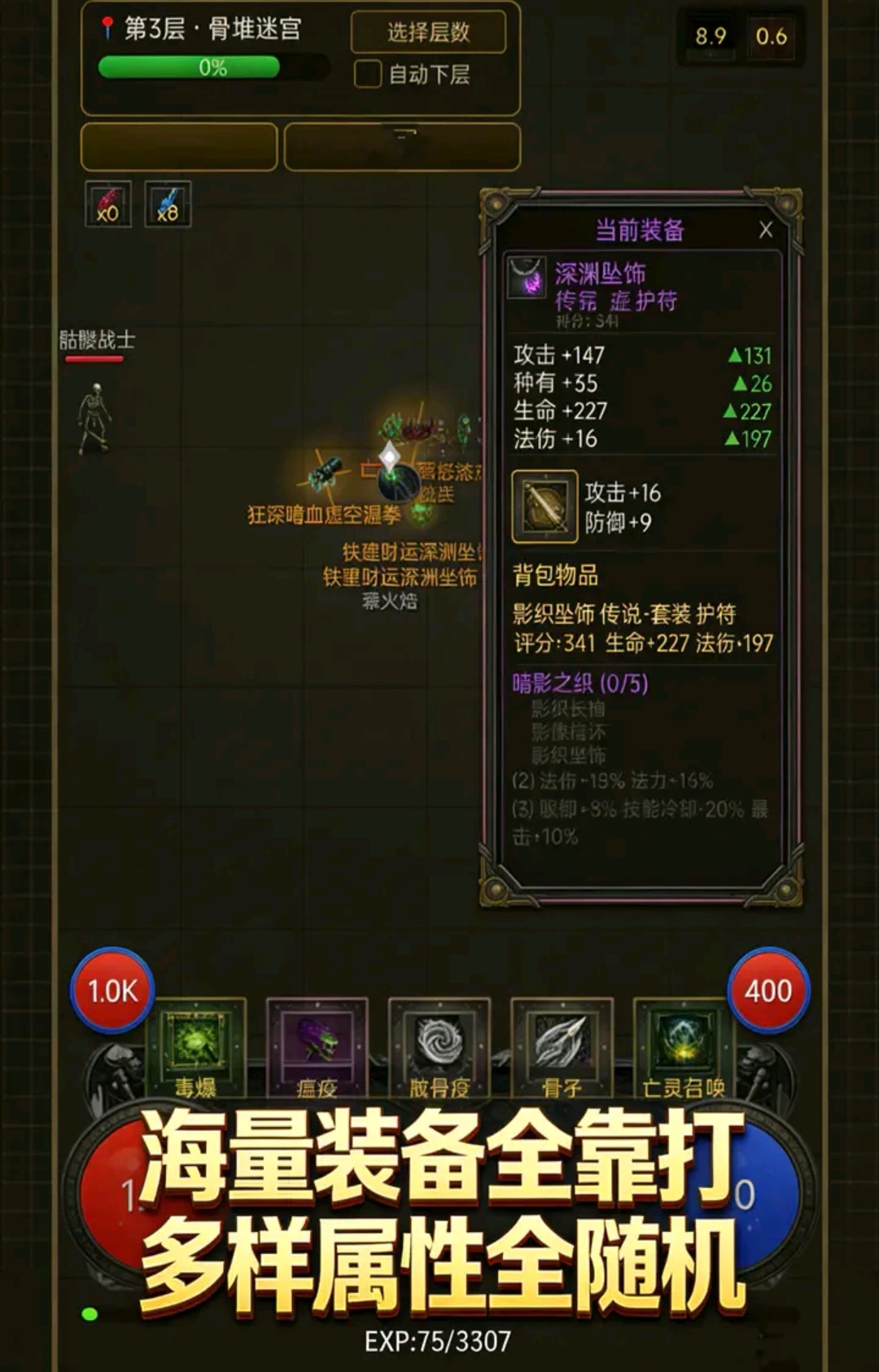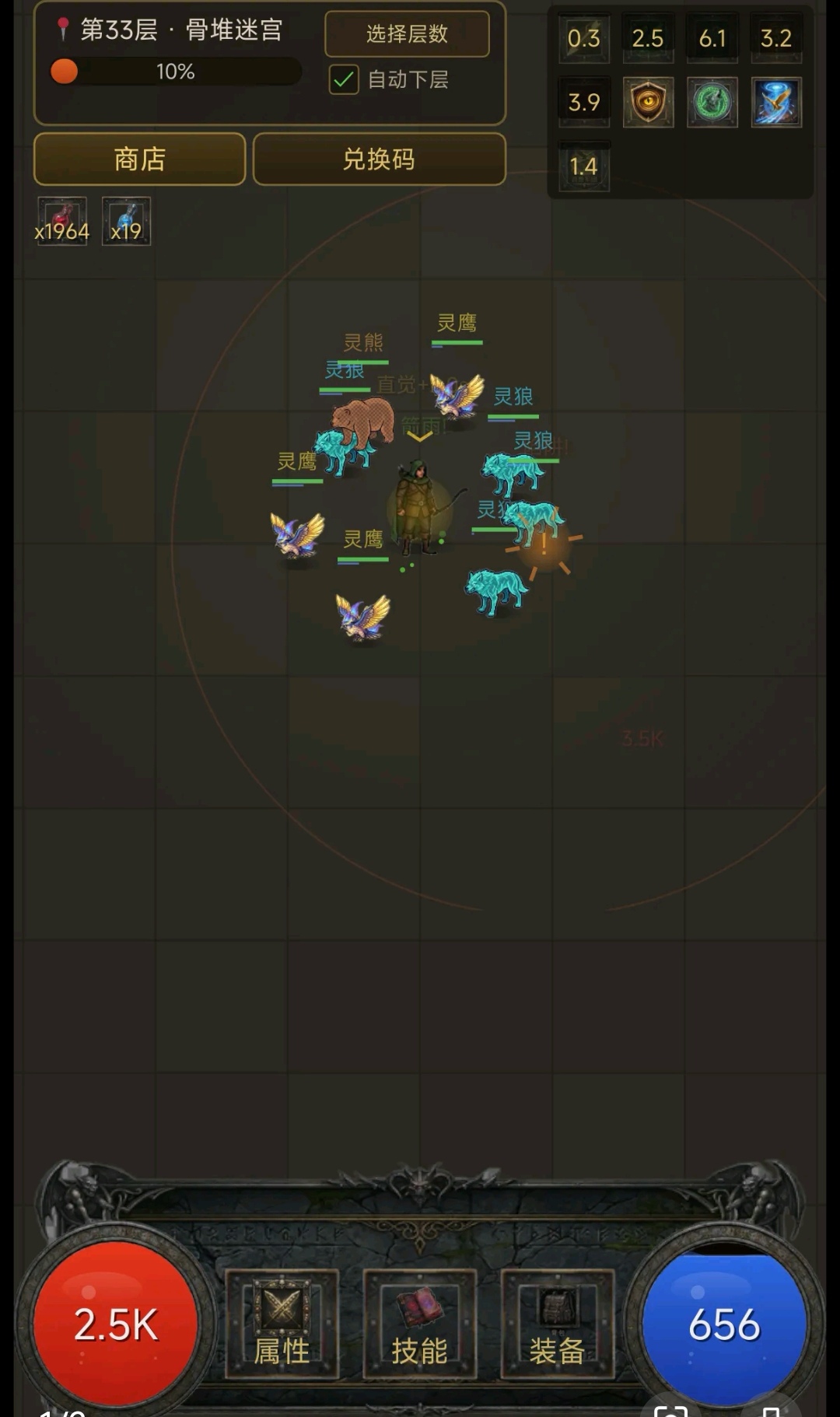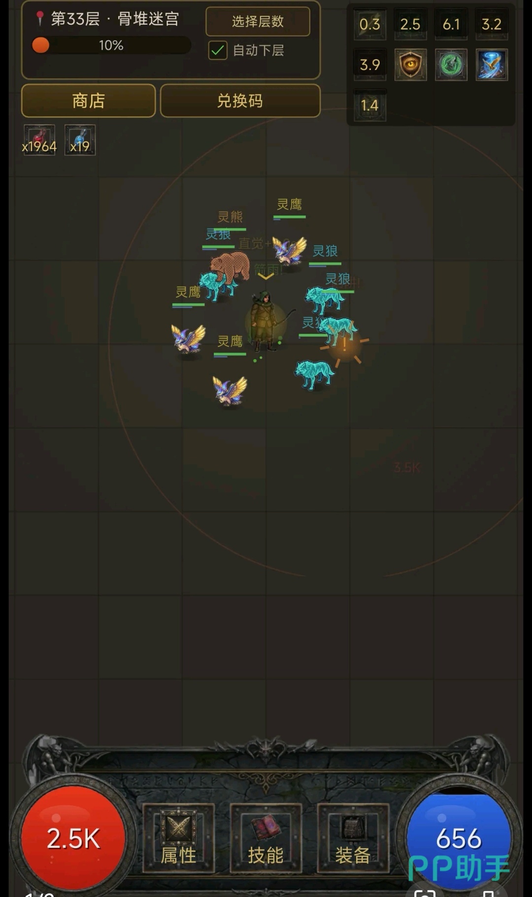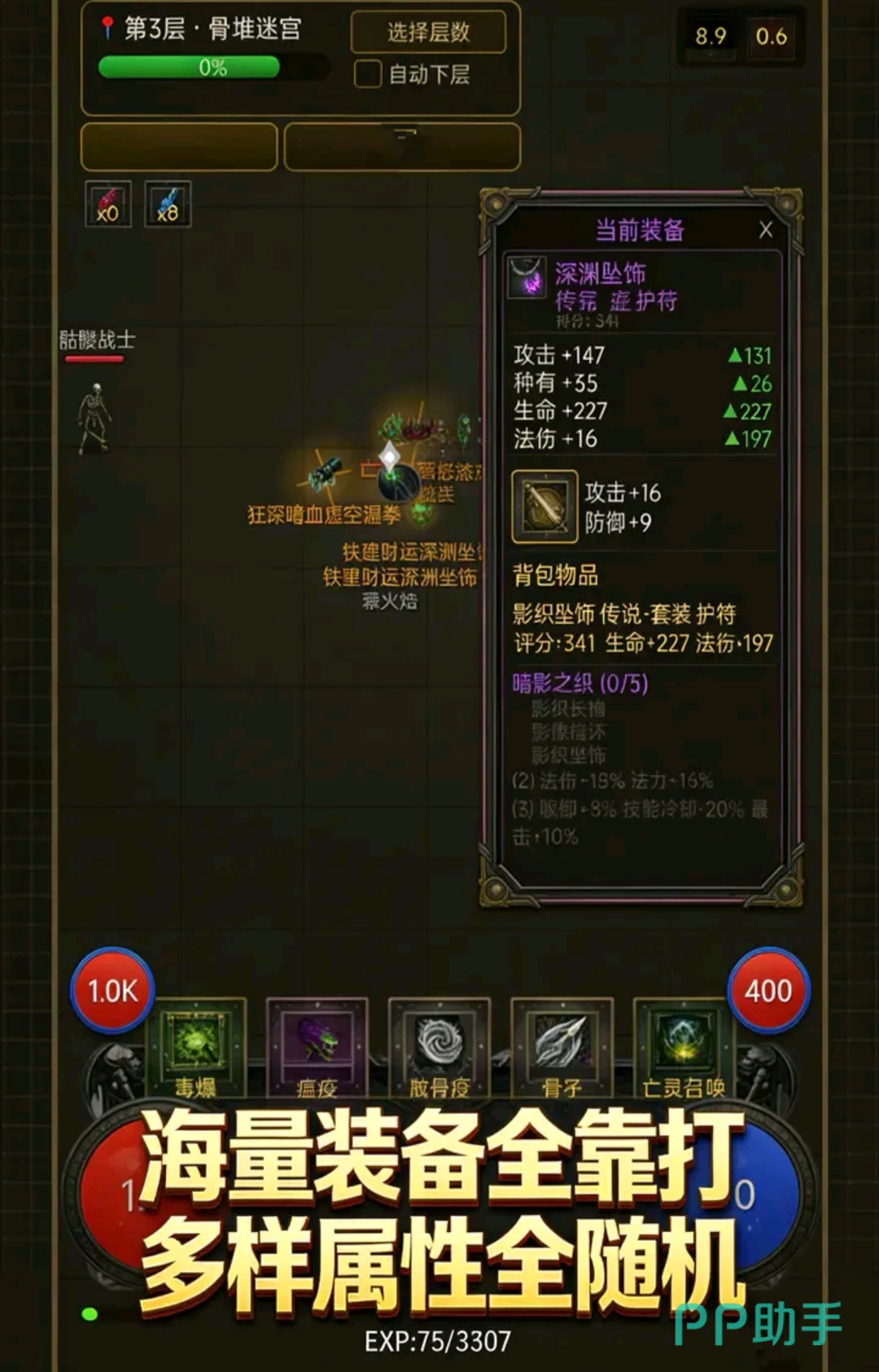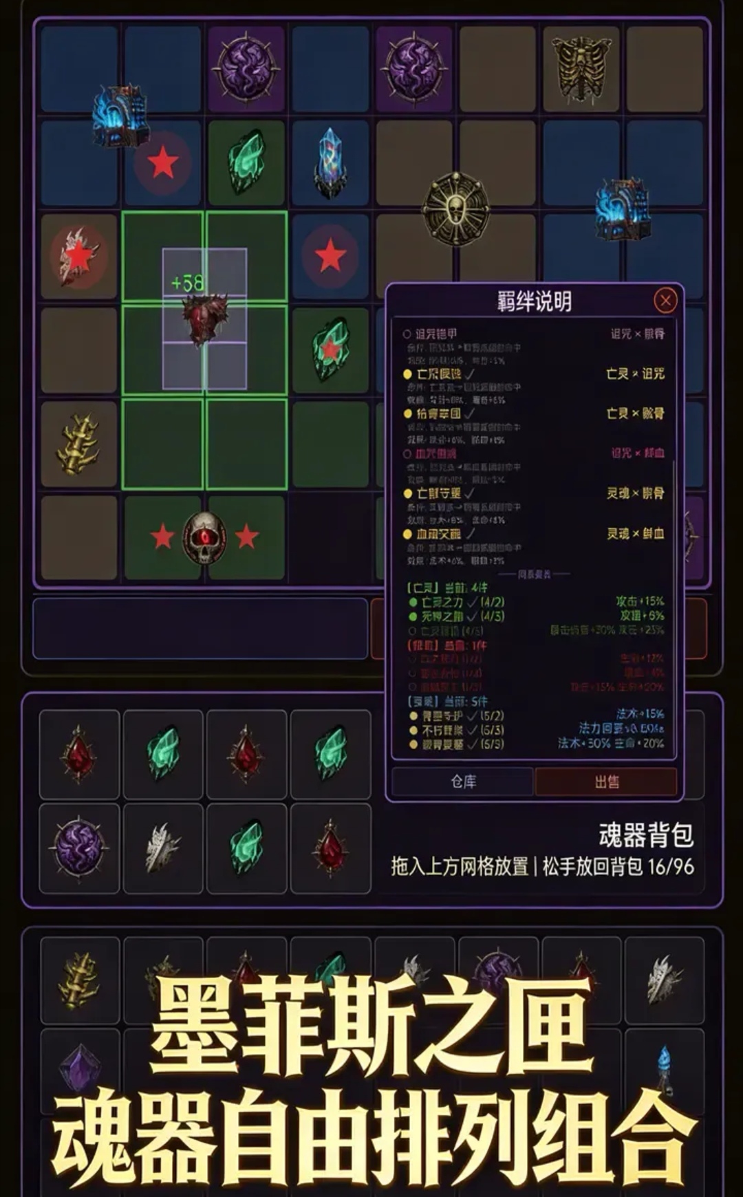 本作采用全自动战斗框架,配合离线收益机制,兼顾休闲性与成长性。核心循环围绕四大模块展开:技能树加点路径选择、装备基础类型搭配、随机词缀(含前缀、后缀、技能刻印、巅峰加点)生成逻辑,以及魂器系统(如墨菲斯之匣)提供的自由排列机制。所有属性联动均实时映射至战斗表现,确保策略决策具备明确反馈。