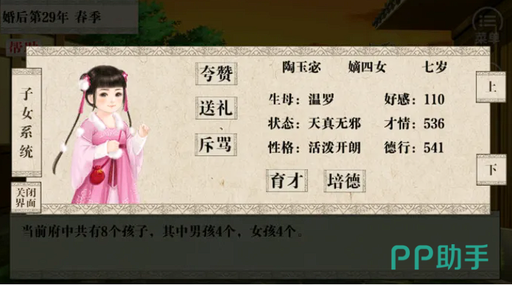 婚后还有一个新的体系就是子女教育,子女满15岁后,玩家可以为他们安排工作和婚事。玩家需要购买教育符文来提高子女的属性,选择合适的老师进行教学,并通过各种活动来提高子女的好感度。这样才能发展的越来越稳。与此同时也可以去参加宴会、捐款和招募高级仆役来提高自己的声望。参加宴会可以增加世家的好感度,而捐款则可以直接提高声望。玩家还需要了解各个世家的喜好和厌恶,以便在社交活动中做出正确的选择。