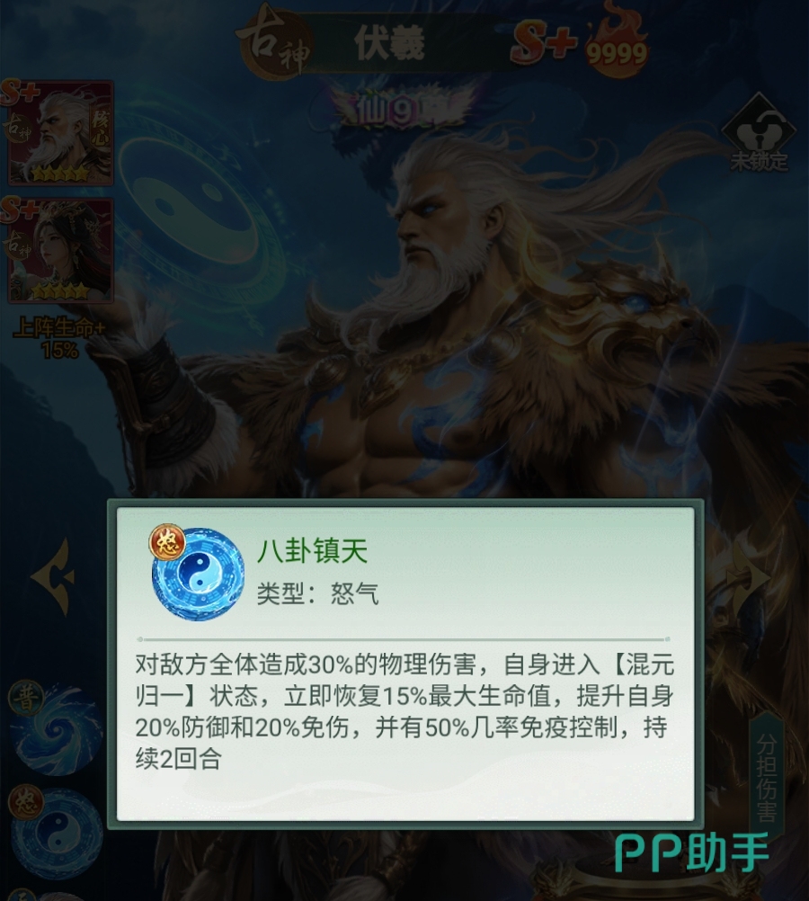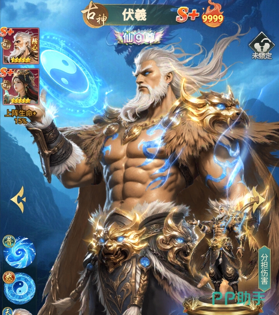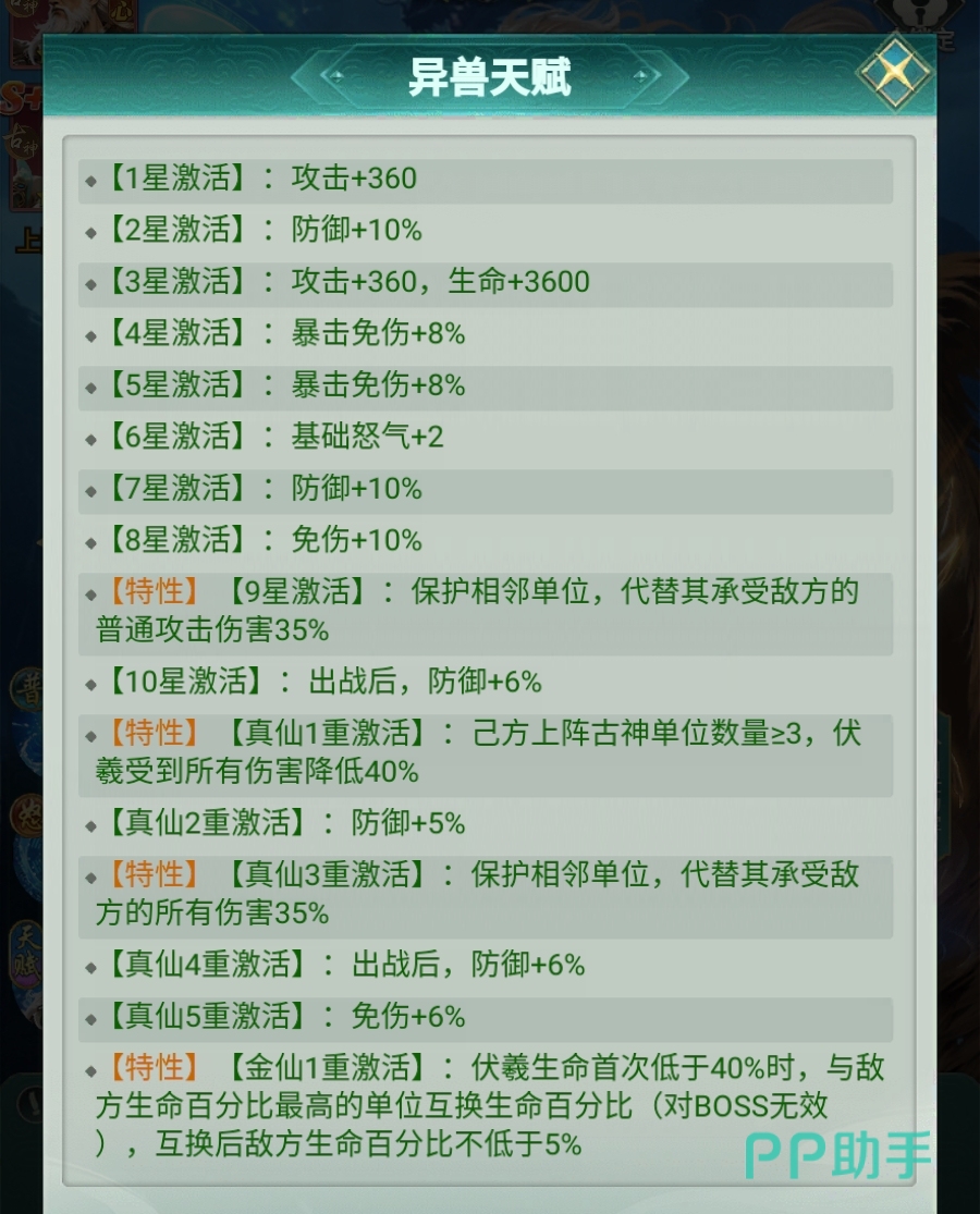 当伏羲突破至9星后,解锁【邻位减伤】被动:可为左右相邻两名队友分担其所受普攻伤害的一定比例,显著降低脆皮队友暴毙风险,缓解治疗压力。若进一步晋升至真仙3重境界,则该分摊效果将覆盖全部类型伤害——无论敌人使用普通攻击还是怒气技能,只要目标为伏羲相邻单位,均能触发伤害转移。此外,在真仙1重阶段,伏羲即可根据己方队伍中古神角色数量获得额外减伤加成,使其与古神体系深度绑定,协同作战优势明显。