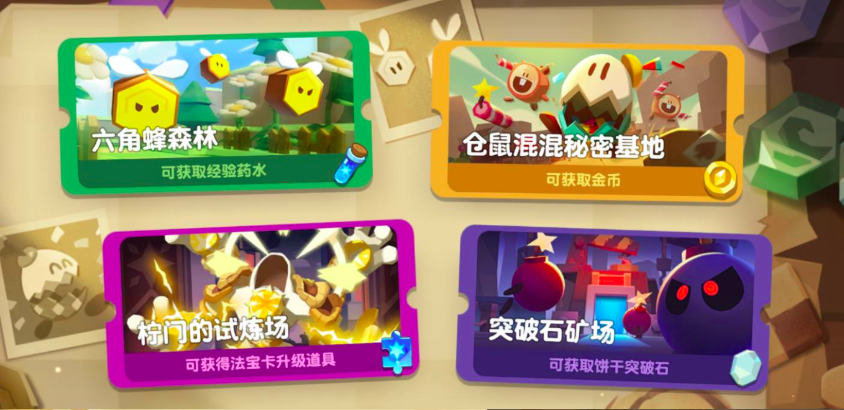 进入中期(等级60起),阵型成型与饼干深度养成成为重心,金币消耗显著增加。此时应调整优先级:仓鼠混混秘密基地 > 六角蜂森林 > 突破石矿场 > 柠门试炼场。当等级达到60后,香蕉族练武场正式开放,其资源产出效率优于突破石矿场,建议直接替代后者,形成新的主力刷图组合。