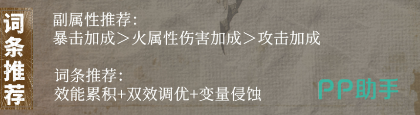 从培养方向来看,赤痕作为火属性输出角色,优先推荐强化暴击率与火属性伤害加成,这将显著提升其技能爆发上限。中期之后可逐步补充削韧效率与基础攻击力属性,进一步优化其对敌方护盾与韧性条的破坏能力。在词条选择上,推荐配置双效调优、连锁破坏、毁灭增幅与引力压制四项核心词条,此类组合能有效增强其多段连击与环境交互能力。