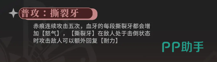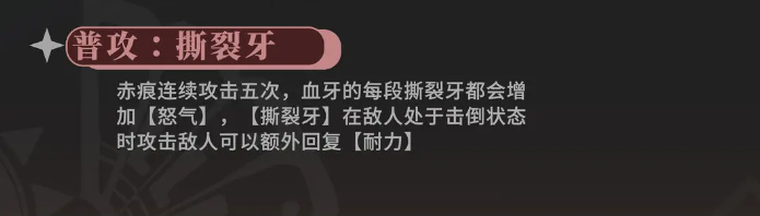 赤痕是一位以火元素为主导的近战输出角色,具备极强的持续伤害能力。他擅长通过削刃机制快速削减敌方防御韧性,从而为团队创造更高的真实伤害窗口。由于其技能体系较为直观且实战效率突出,制痕也被视为适合新手过渡使用的强力单位。在组队时,可将其编入以近战为核心的阵容中,配合其他高伤角色形成连贯压制链。