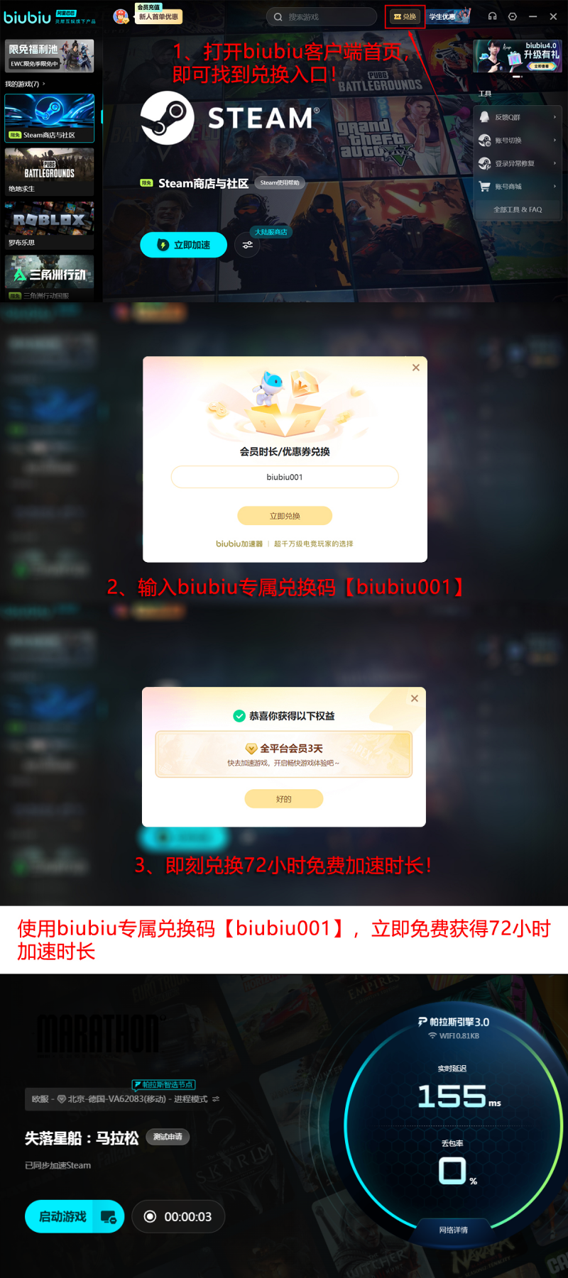 当前推出限时福利:新用户注册即赠24小时加速时长;所有用户输入兑换码【biubiu001】,均可额外领取3天免费加速权益。新用户叠加使用,最高可享96小时免付费加速服务。