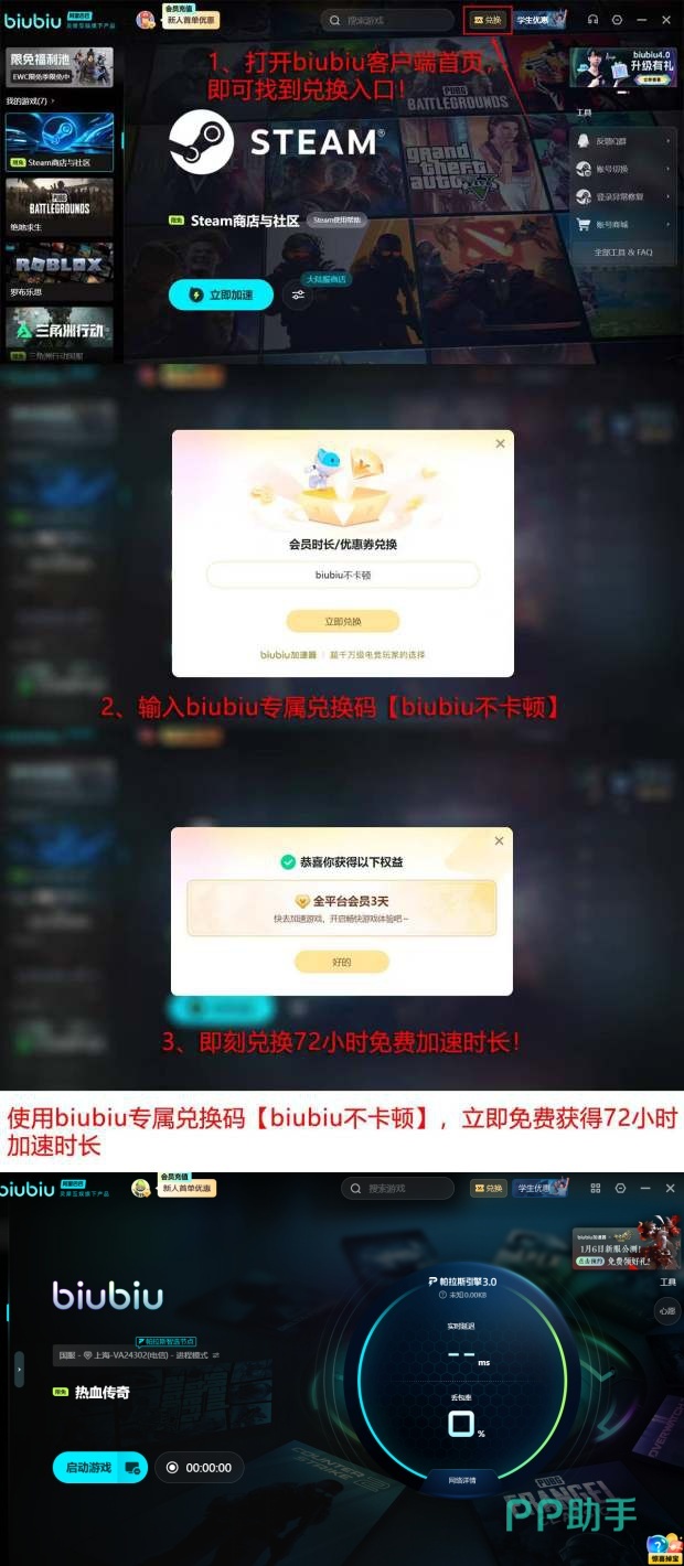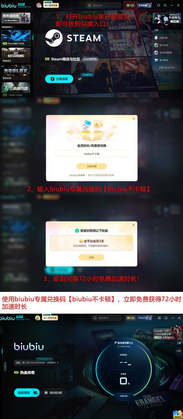 为降低试用门槛,官方提供总计96小时的免费加速权益:新注册用户自动获赠24小时基础时长;另可通过输入兑换码【biubiu不卡顿】额外激活72小时高级服务。该累计时长目前为行业独家配置,覆盖完整新手适应周期与中期深度体验阶段。