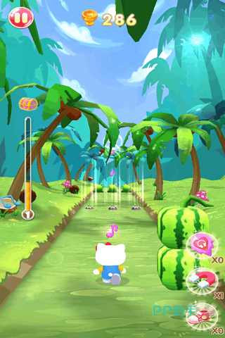 《凯蒂猫跑跑乐》标新立异的把音乐元素与跑酷,进行了巧妙绝伦的结合,游戏呈现了令人如痴如醉的场景设计,其中每个场景中背景的特效,包括颜色的搭配,均呈现者与众不同之处,玩家操控着活泼灵动的凯蒂猫,一路欣赏着目见心喜的美景,一路展开撒欢的奔跑,游戏还融入了以乐器为原型,奇妙的加成道具。