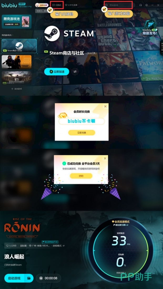 新用户使用上方给大家提供的加速器的时候是可以得到不少福利的,比如注册的时候就会有3小时免费加速时间,后面还可以像其他老用户一样用biubiu不卡顿去继续换三天的加速时间,还能够继续享受相应的加速服务。