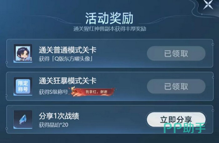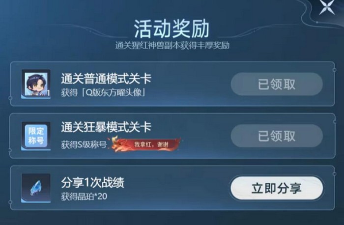 整体来看,猩红神兽战斗机制清晰、节奏明确。把握好破势窗口期集中火力输出,合理规划伽罗E技能释放时机以应对红光压制,即可稳定达成通关目标。完成狂暴模式挑战后,“我拿红,谢谢”限定称号将自动发放至账户,同步还可通过分享战绩预约20颗晶珀资源。