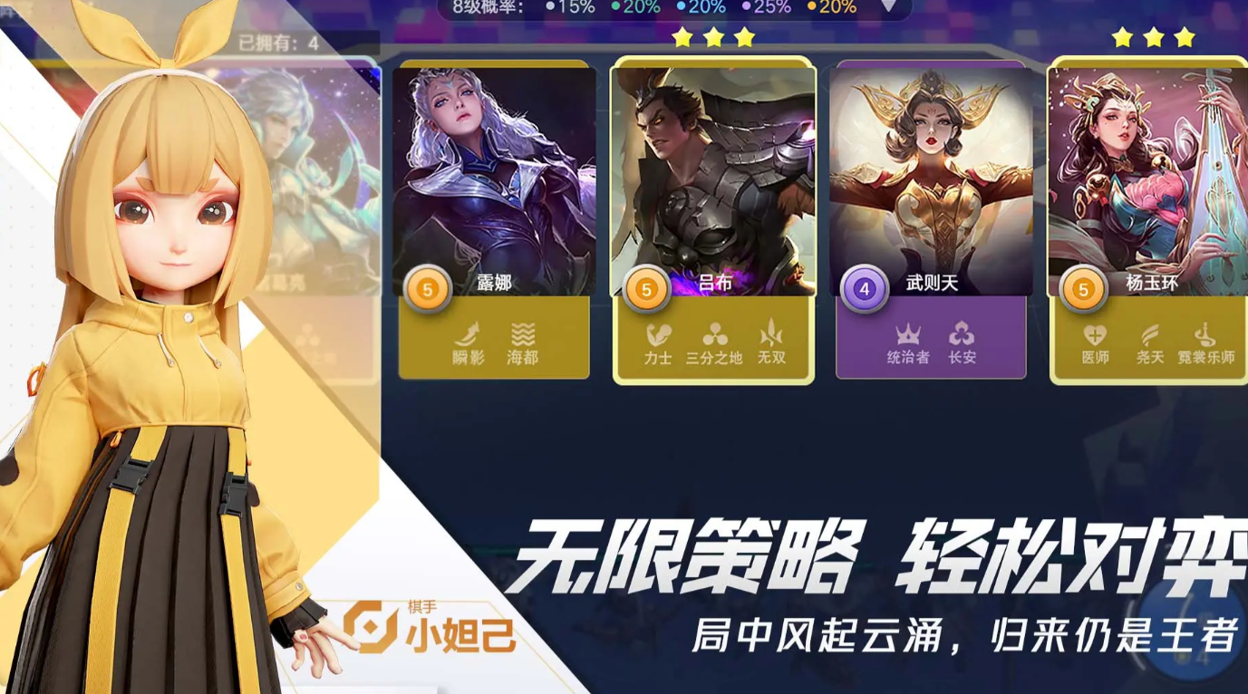 游戏内的所有英雄,都按照了王者荣耀原版的设定进行制作,其中包含有法师,战士、刺客、射手等等,在自走棋的模式当中,玩家可以选取任意一种发展流程,例如,玩家可以选择站桩输出型的后羿,合成最高等级,同样能够发挥出极高的战斗力。