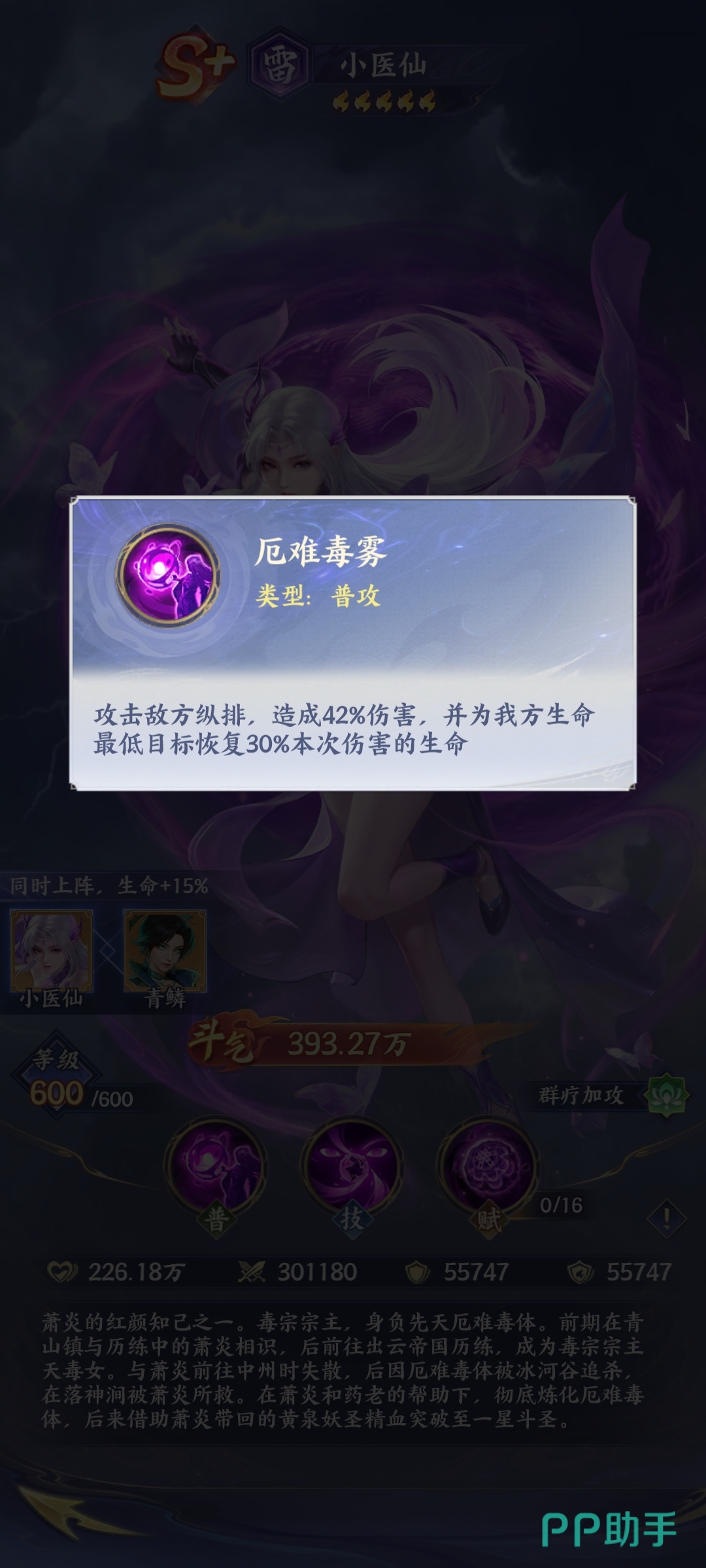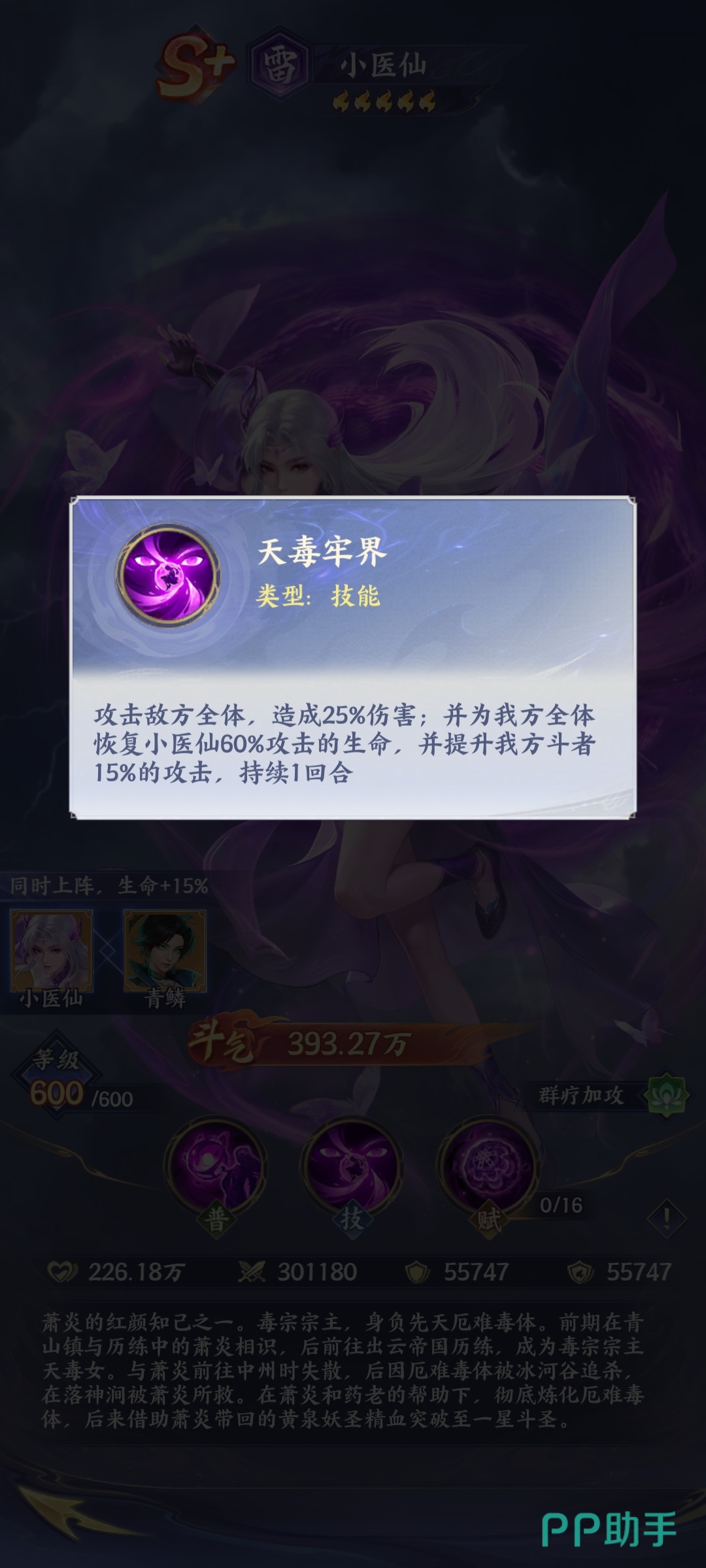 其终极技能【天毒牢界】是扭转战局的关键大招:开启后立即为全体己方单位回复固定数值+百分比最大生命值,并在接下来一整回合内提升全队攻击力。该增益效果可与输出型角色(如萧炎、美杜莎)形成强力协同,尤其适用于Boss战第二阶段或PVP抢节奏阶段。