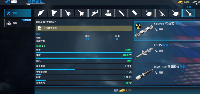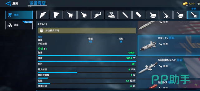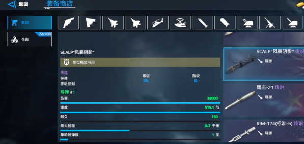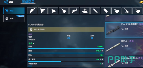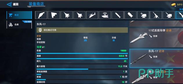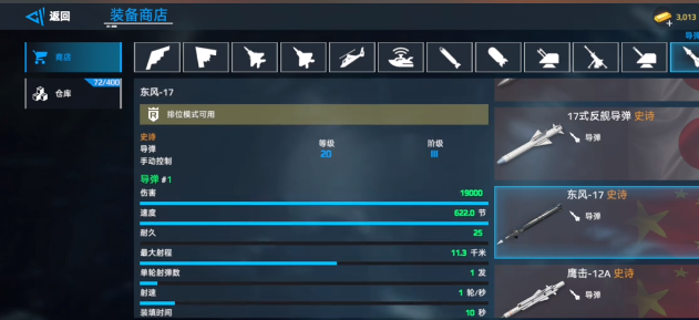 接着玩家也可以关注东风17,拥有一个比较快的速度,会拥有一个比较优秀的突防效果。除了这些之外,玩家还可以关注17式反舰导弹,作为一个黄金导弹,那自然整体的优势都会超过于美金导弹。