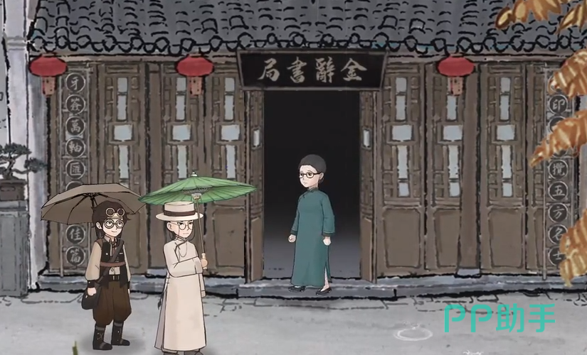 进入第五章后,首要目标是前往金辞书局。沿着场景右侧前行不久,即可看到书局入口。抵达门口时,会有一位女性角色出面接待,并提及此前第一、二章中关于佩罗镇事件的相关信息。进入书局内部后,任务核心是寻找一本与“斗室疑阵”直接相关的书籍,虽然书名未知,但已知其存在关键联系。