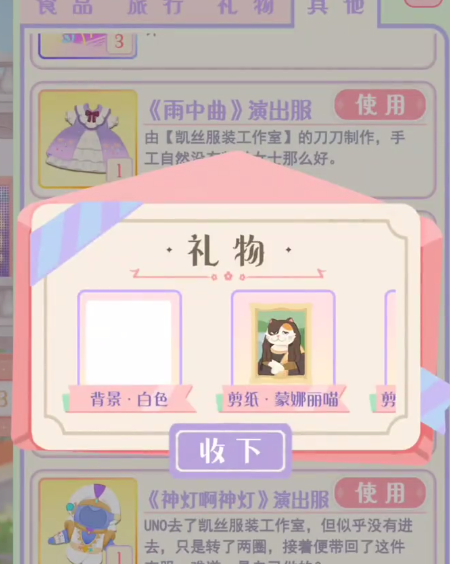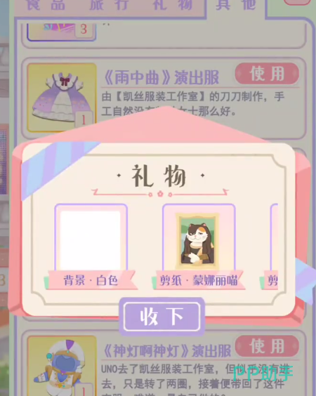 花花与幕间剧购物玩法相对来说还是比较简单的,不需要复杂的操作,会购物也没有多余的设定,玩家只需要按照自己的需求购买这些物品就可以,除了直接购买物品用来让这些角色使用之外,还可以购买一些礼物赠送给其他的成员,这是能增加好感度的,需要注意的是,把物品放到角色背包之后,需要拉好拉链,否则无法触发后续的事件。