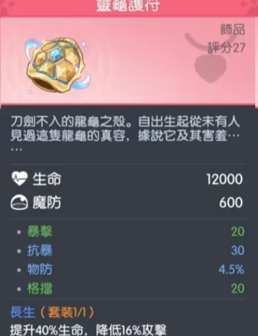 备选方案为灵龟护符。该饰品虽小幅降低攻击力,但提供可观的基础生命值与格挡属性,适用于敌方爆发型角色集中、前排承伤压力陡增的对局场景,显著提升雅典娜的容错空间。此外,在敌方阵容强针对前排或我方缺乏坚实副坦支援时,可切换为生命套装。该套装通过堆叠基础生命上限与对抗属性,增强整体生存韧性,确保关键控制技能(如大招嘲讽)能在决胜时刻稳定释放。需注意:生命套装会略微降低技能释放密度,因此调整前应结合队伍整体控制链完整性及后排保护能力综合判断。