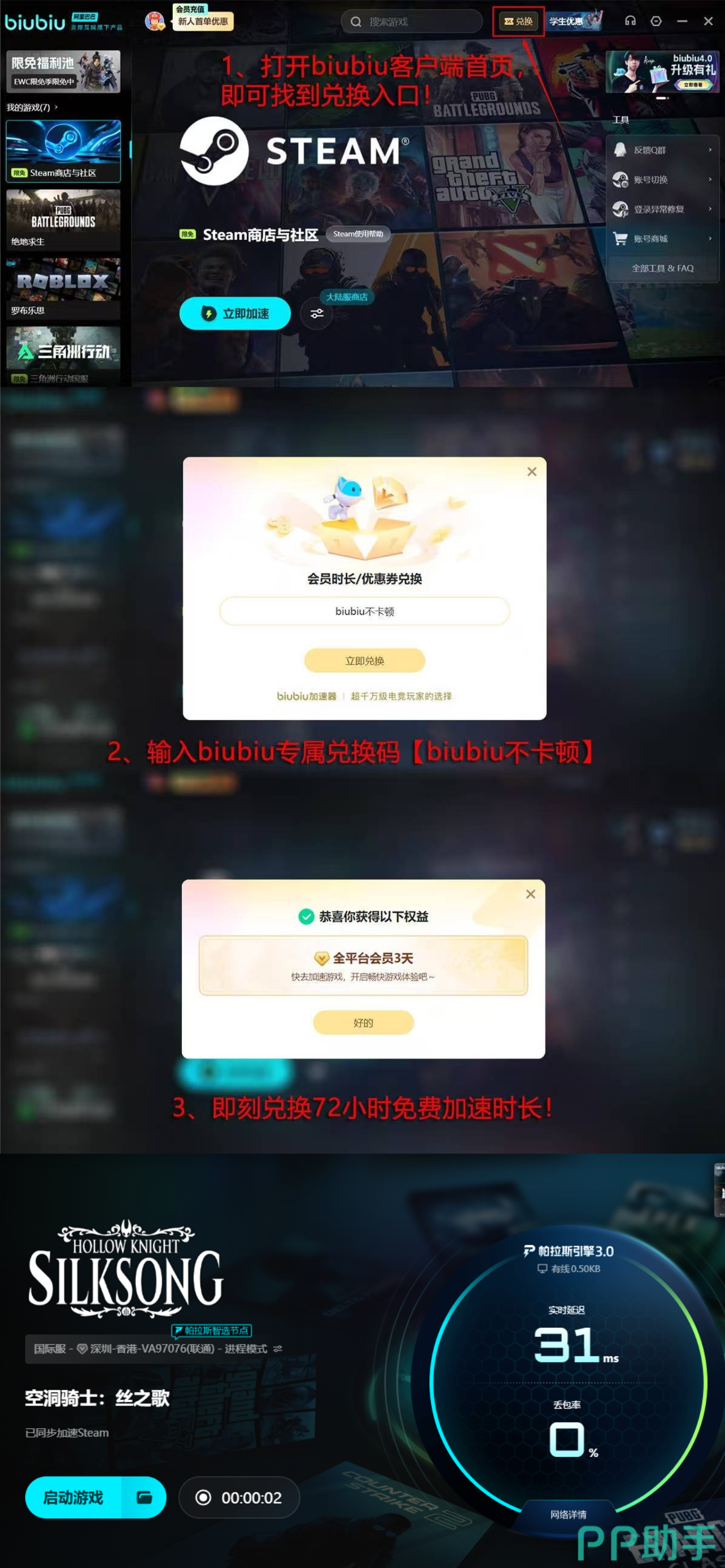 新用户注册后即可领取24小时免费加速时长,新老用户还可通过首页输入口令【biubiu不卡顿】兑换额外72小时加速时长。参与活动的新用户总计可获得96小时免费使用权限,所有时长均可自由用于任意游戏,无时段与游戏类型限制。