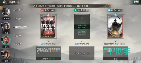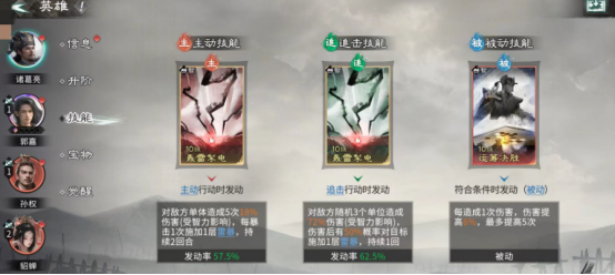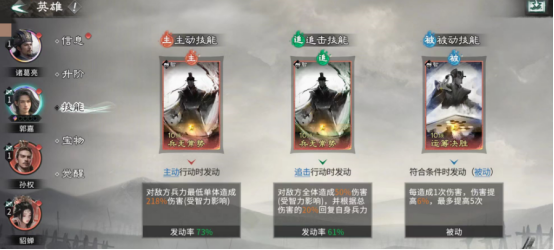 该阵容以孙权为战术支点,需搭配诸葛亮与郭嘉组成铁三角组合。三者缺一不可:诸葛亮提供前排承伤与弱点洞察能力,可无视触发限制高频反制敌方进攻;孙权居中后排,依托站位协同触发四维属性加成效果;郭嘉则强化智力压制与战场应变,在拼点阶段显著提升我方成功率与容错空间。此配置不仅保障输出稳定性,更在兵力续航维度形成显著优势。