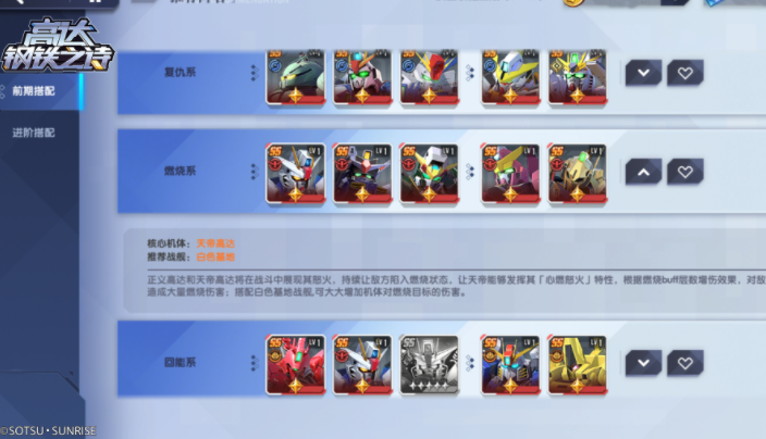 同时玩家也可以选择一个主打攻击的流派,这时候就可以把炎魔天帝高达和裁决正义高达这两个角色放在一起,两个高达可以连起手来,给对方带来巨大的伤害,加上这两个高达都有火焰输出的能力,可以通过火焰燃烧,让对方丧失战斗能力,再搭配上破晓自由高达,让队伍的战斗能力更上一层楼,破晓自由高达,如果遇到了带有燃烧状态的对手,攻击的时候就能有额外增伤效果,这三个高达可以联合起来,借助各自的能力给对方带来巨大的打击。